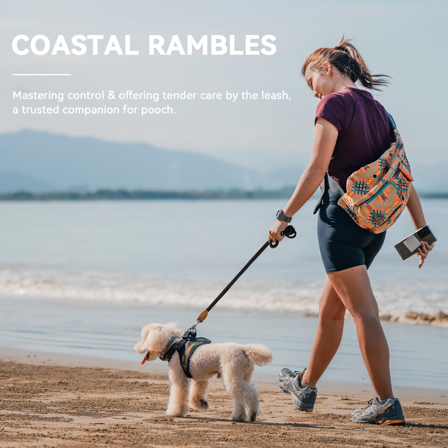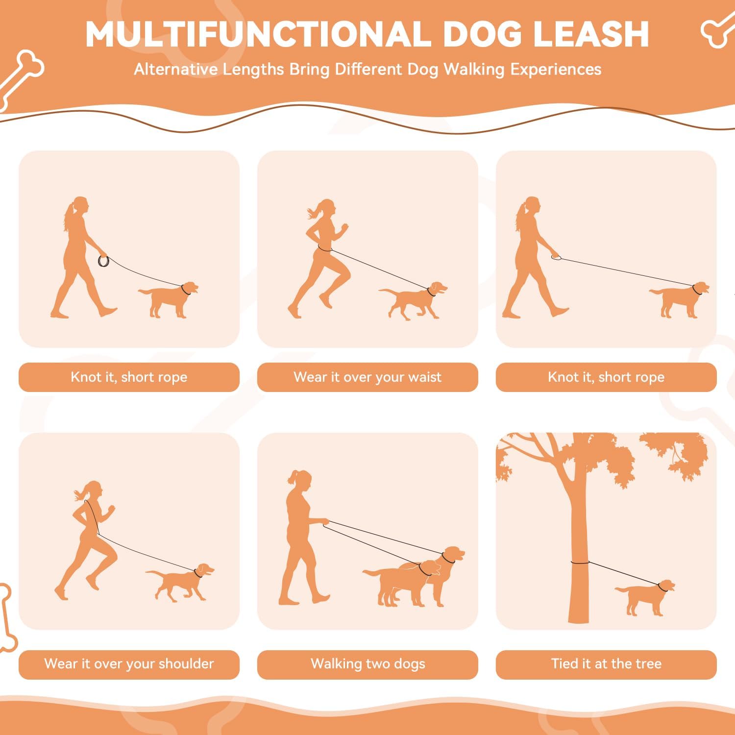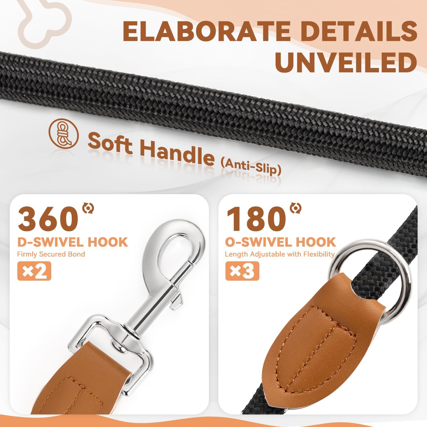 • Висококачествени материали: поводът е изработен от двуслоен найлон с 2 въртящи се карабинки и 3 примки от неръждаема стомана. По-издръжлив е от кожата и има светлоотразителни ленти за безопасност по време на нощни пътувания.