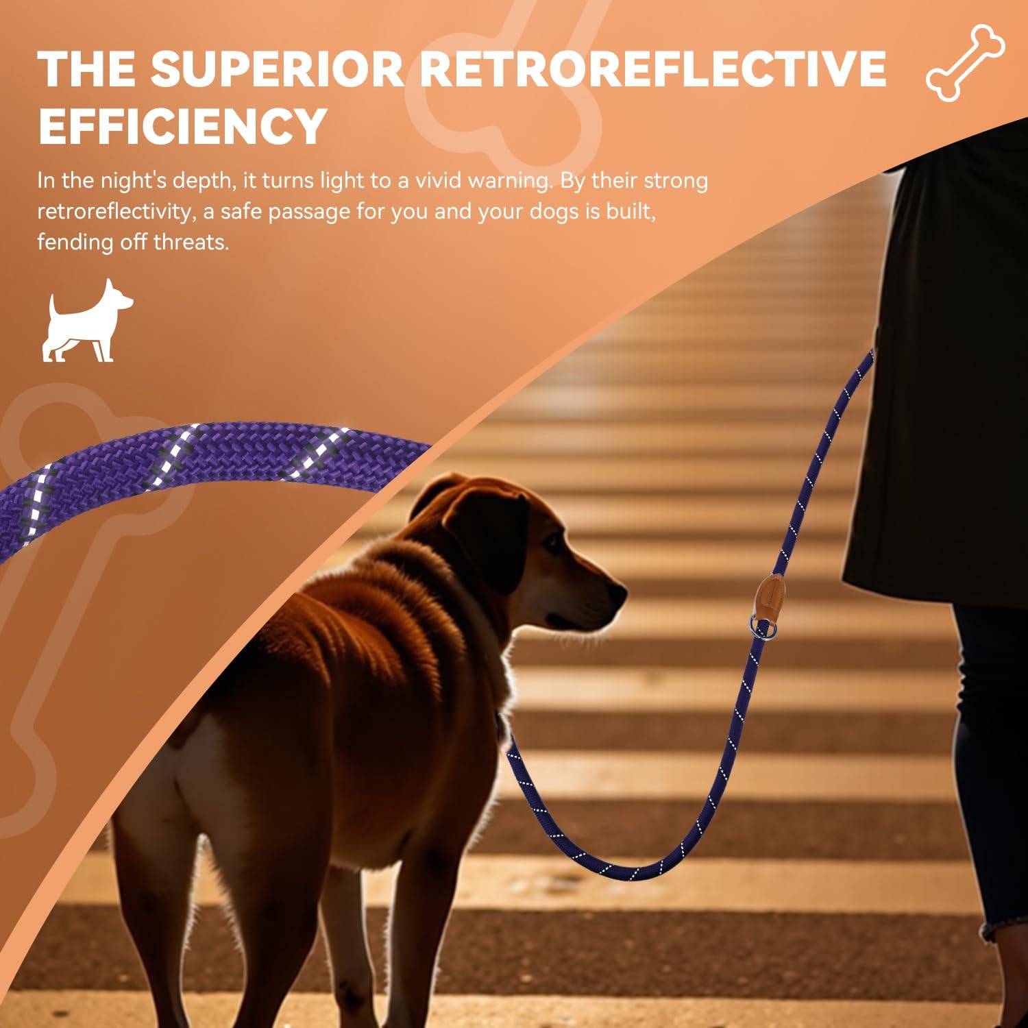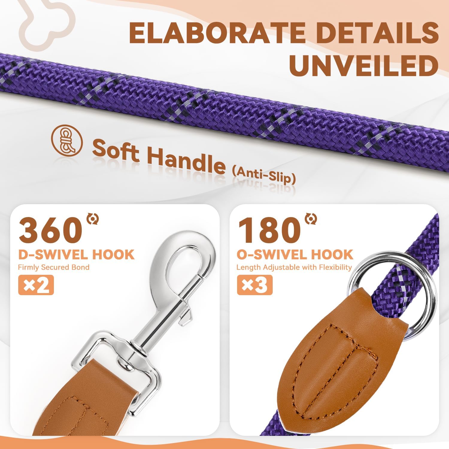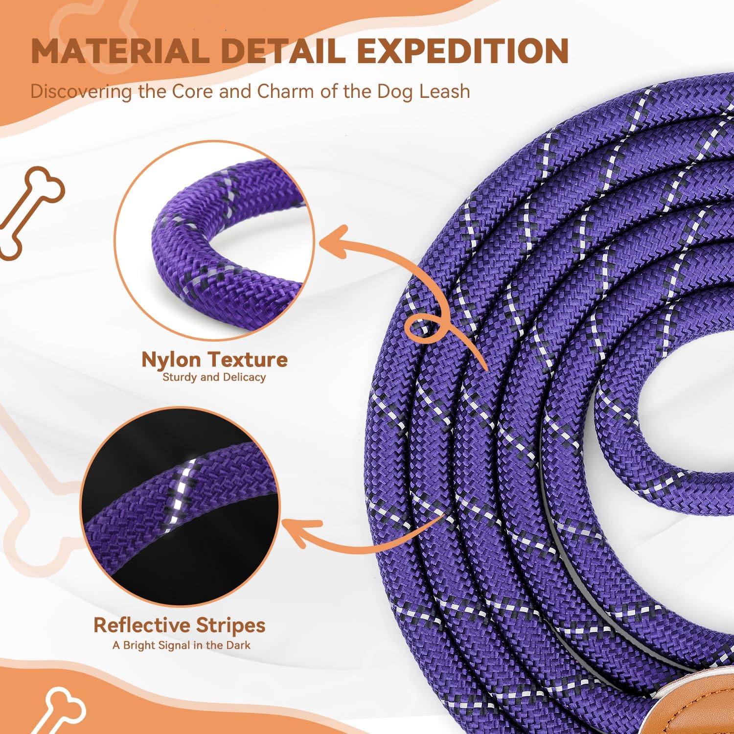 • Висококачествени материали: поводът е изработен от двуслоен найлон с 2 въртящи се карабинки и 3 примки от неръждаема стомана. По-издръжлив е от кожата и има светлоотразителни ленти за безопасност по време на нощни пътувания.