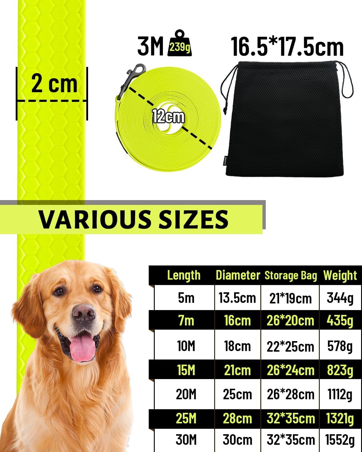 • 3-30 м, няколко цвята за избор: Късият повод за бягане е подходящ да вземете кучето си със себе си в града или на оживени места, за да предотвратите изгубване или нараняване на кучето. Средният повод за привикване е подходящ за тренировки по проследяване или ежедневни разходки, дългият повод за куче е подходящ за полета, гори, пасища и др., за да може кучето ви да тича.