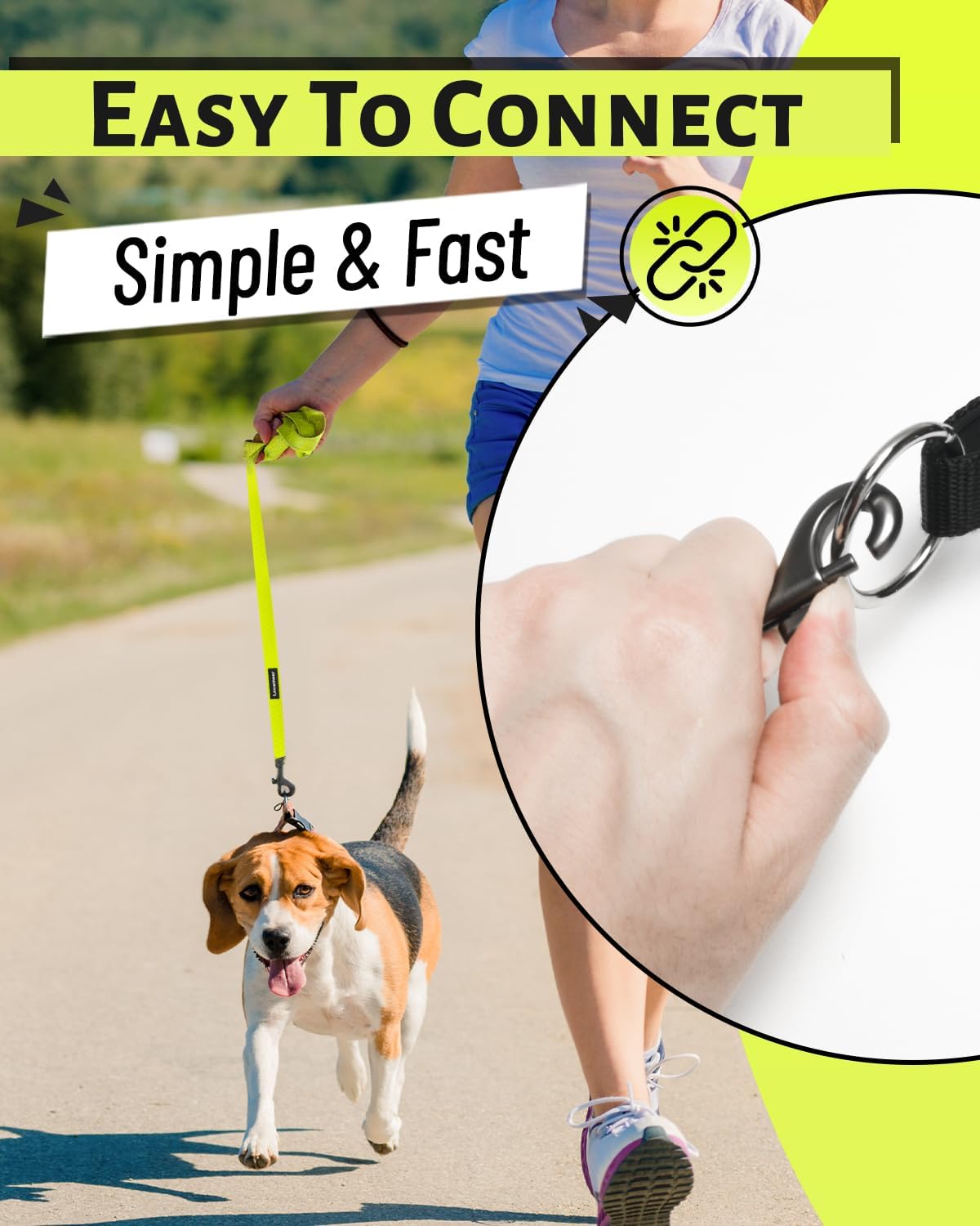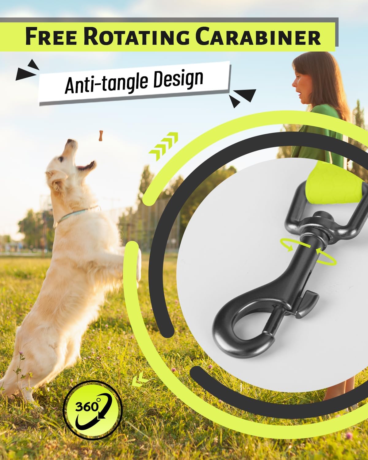 • Ергономична дръжка и въртящ се на 360° карабинер: Дръжката на повода за кучета е снабдена с мека памучна подплата, която може да намали натиска върху ръцете ви, позволявайки на вас и вашето куче да играете на открито дълго време. Въртящият се на 360° карабинер е лек, здрав и може бързо да се прикрепи към нашийника, без да се отваря. Така кучето ви е в безопасност и все още може да души наоколо.