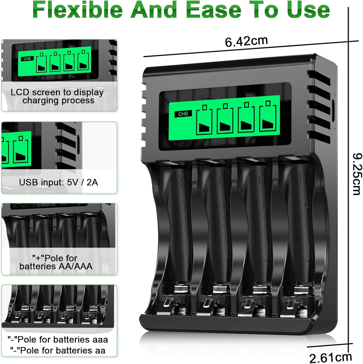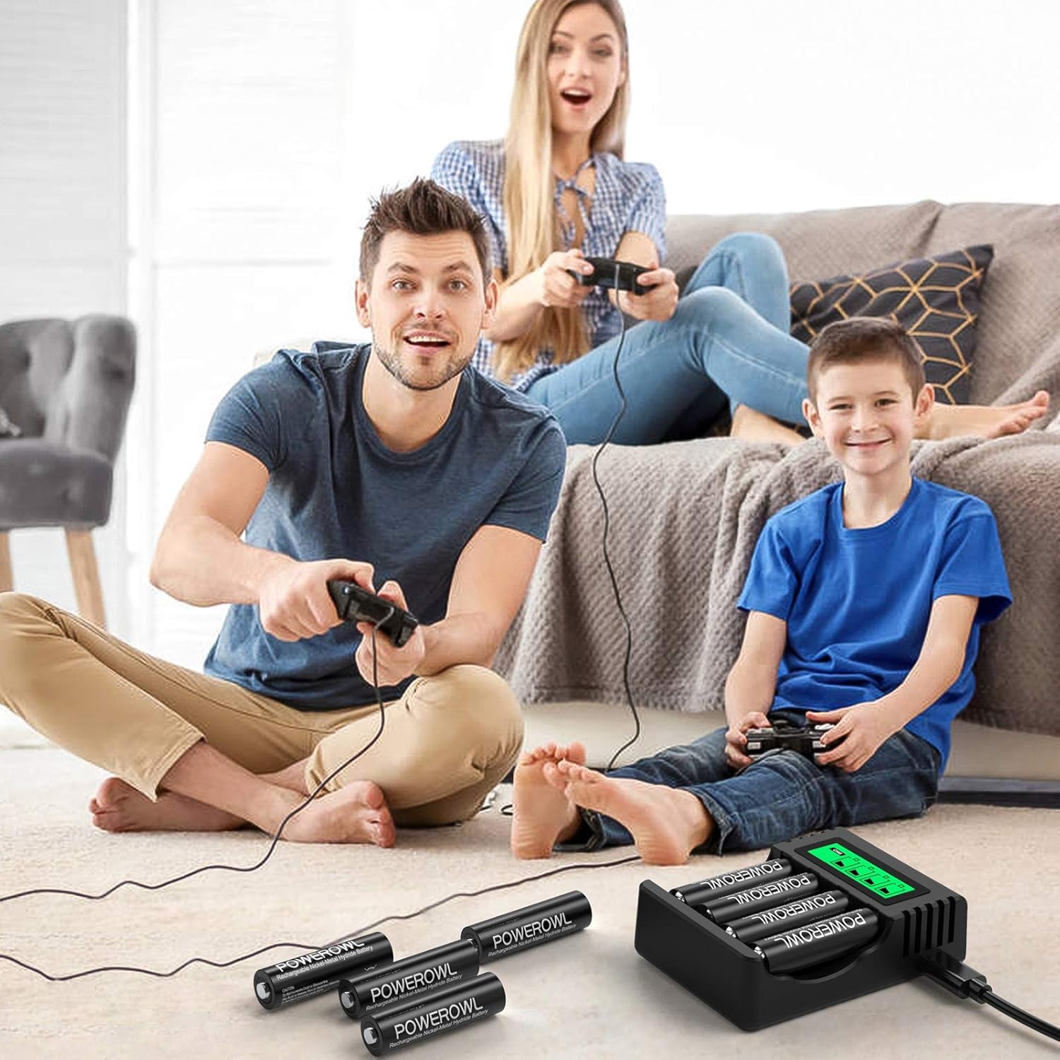 POWEROWL AA батерия със зарядно устройство, пакет от 8 AA батерии 2800 mAh NI-MH с интелигентно зарядно устройство с 4 слота (бързо зареждане през USB, независим слот)