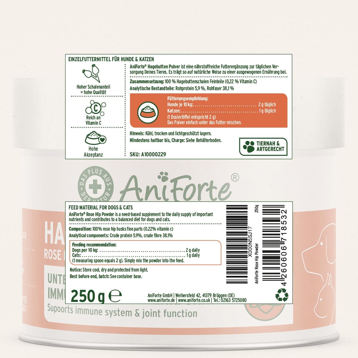 Прах от шипки AniForte за кучета и котки 250 г – 100% шипки, богати на витамин C, за подпомагане на имунната система