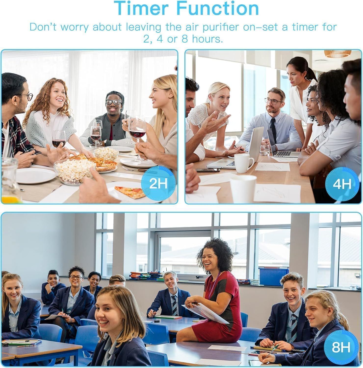 • 3 СКОРОСТИ НА ВЯТРА И ТАЙМЕР Можете да избирате ниска, средна и висока скорост на вятъра според въздушните условия, за да пречистите ефективно въздуха. С опцията за таймер (2H/4H/8H) можете да настроите пречиствателя на въздух да работи за определено време, което ви помага да пестите енергия и пари. Детската защита предотвратява злоупотреба от домашни любимци и деца.