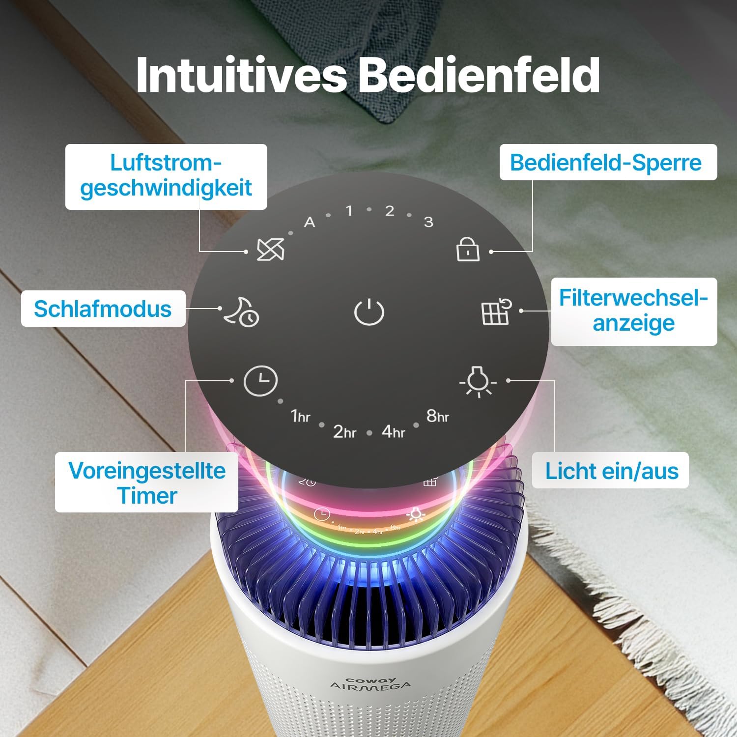 Пречиствател на въздух COWAY за хора с алергии в спални и малки стаи, тих пречиствател на въздух с шум 18,4 dB, CADR 120,1 m³/h, осветление за настроение, автоматичен филтър за полени, прах, домашни любимци и дим, AIRMEGA 50
