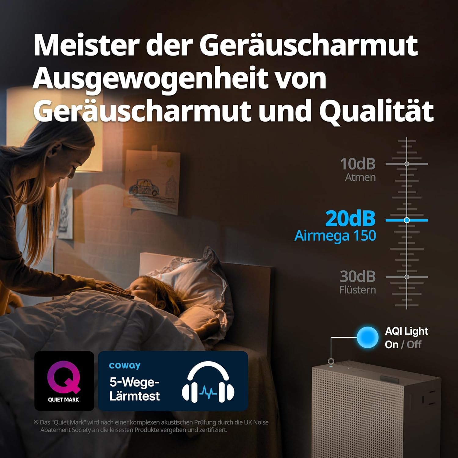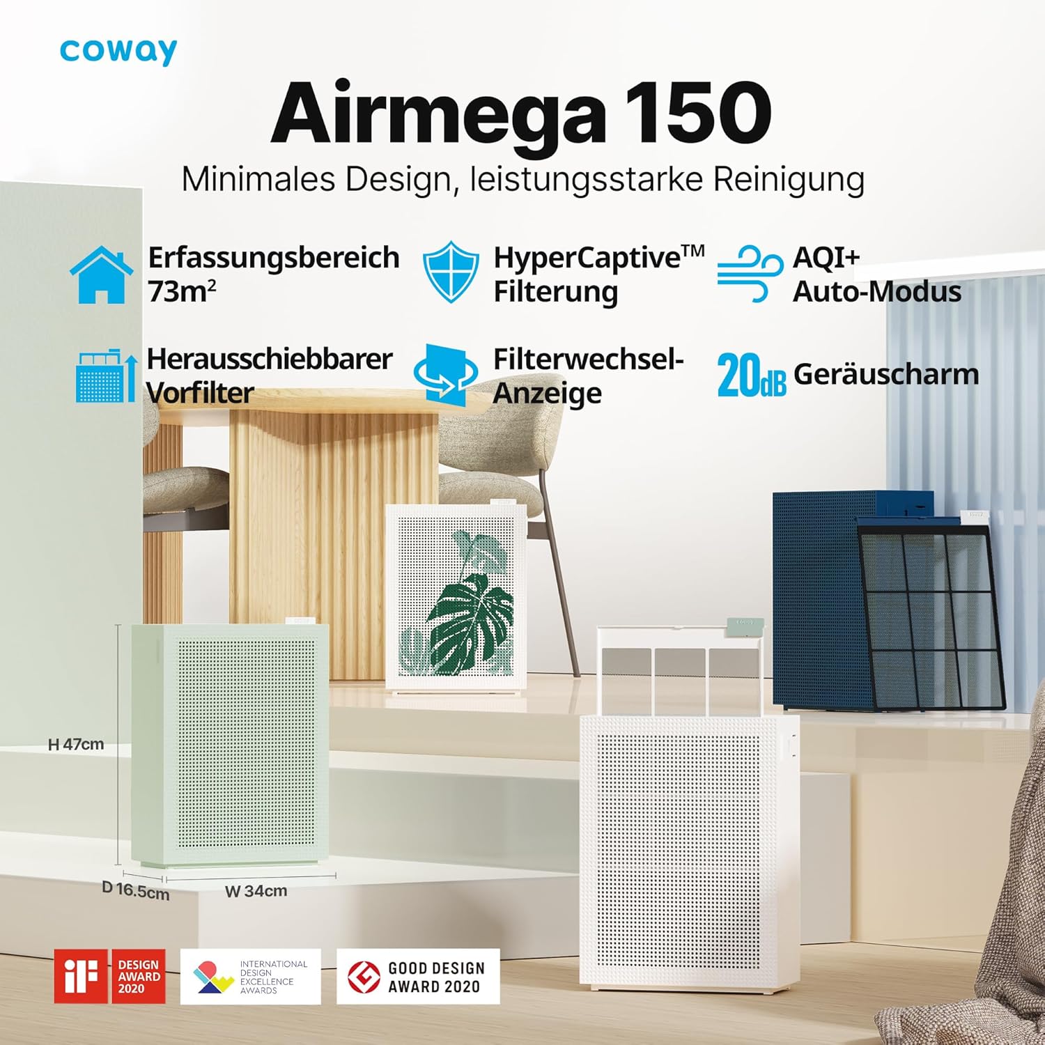 Пречиствател на въздух COWAY за страдащи от алергии, Quietmark, 20 dB режим на заспиване, премахва 99.999% от вредните частици до 0.01 µm, за алергии (ECARF печат) прах полени - Airmega 150 (тъмносин)