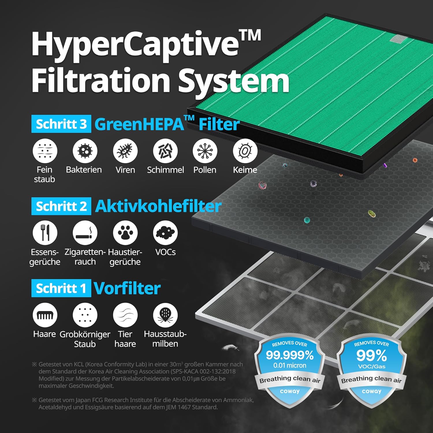 • ЕЛИМИНИРА 99,999% ОТ АЛЕРГЕННИТЕ ЧАСТИЦИ ВЪВ ВЪЗДУХА: Комбинацията от предфилтър, дезодориращ филтър и GreenHEPA филтър премахва 99,999% от наночастиците с размер до 0,01 микрона, включително полени, прах, дим и други алергени. Филтърът също така намалява 99% от летливите органични съединения и миризми.