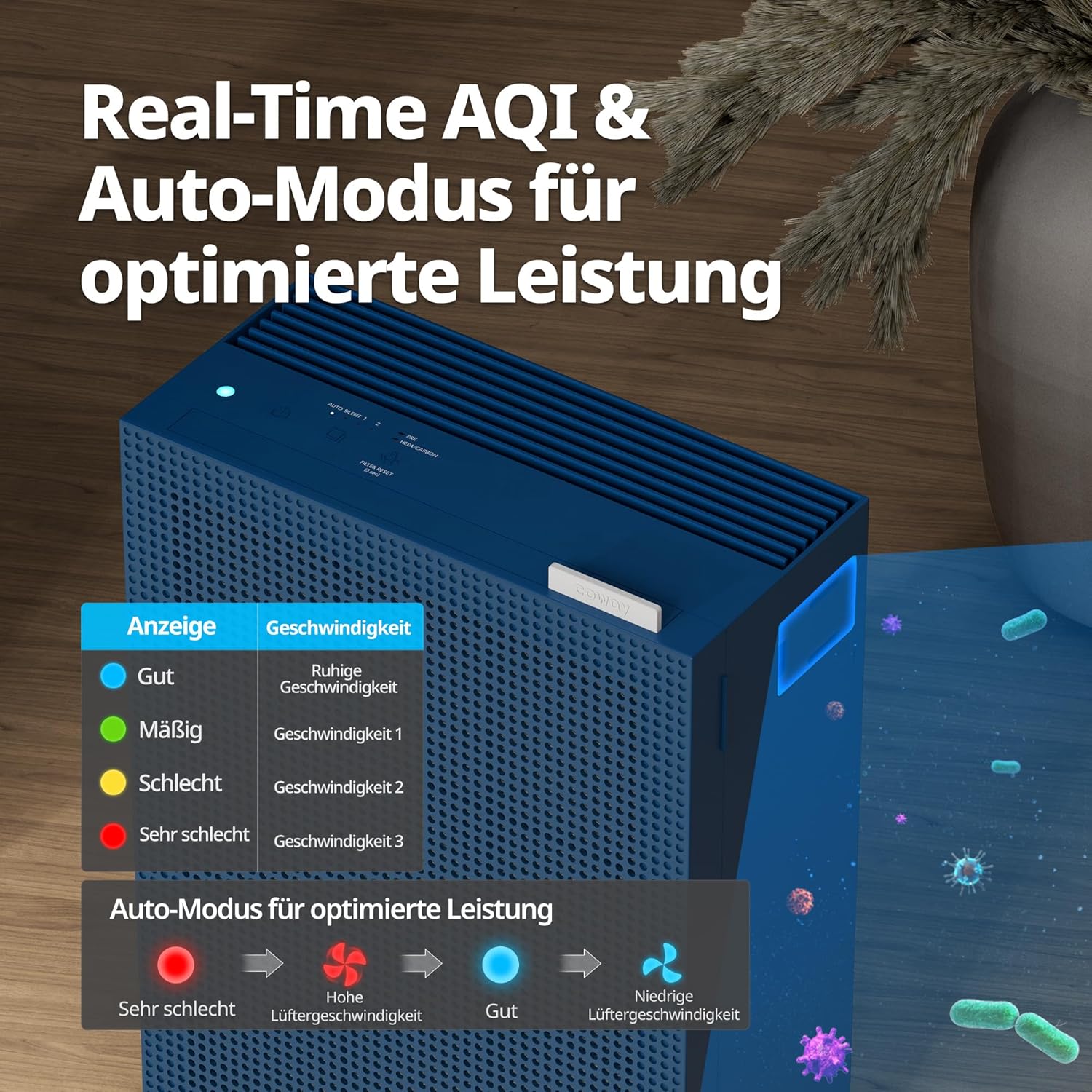 • Енергоспестяваща технология: Проектирано за ефективност, устройството интелигентно следи качеството на въздуха в автоматичен режим и автоматично регулира скоростта на вентилатора, за да почисти ефективно стаята ви, като същевременно пести енергия.