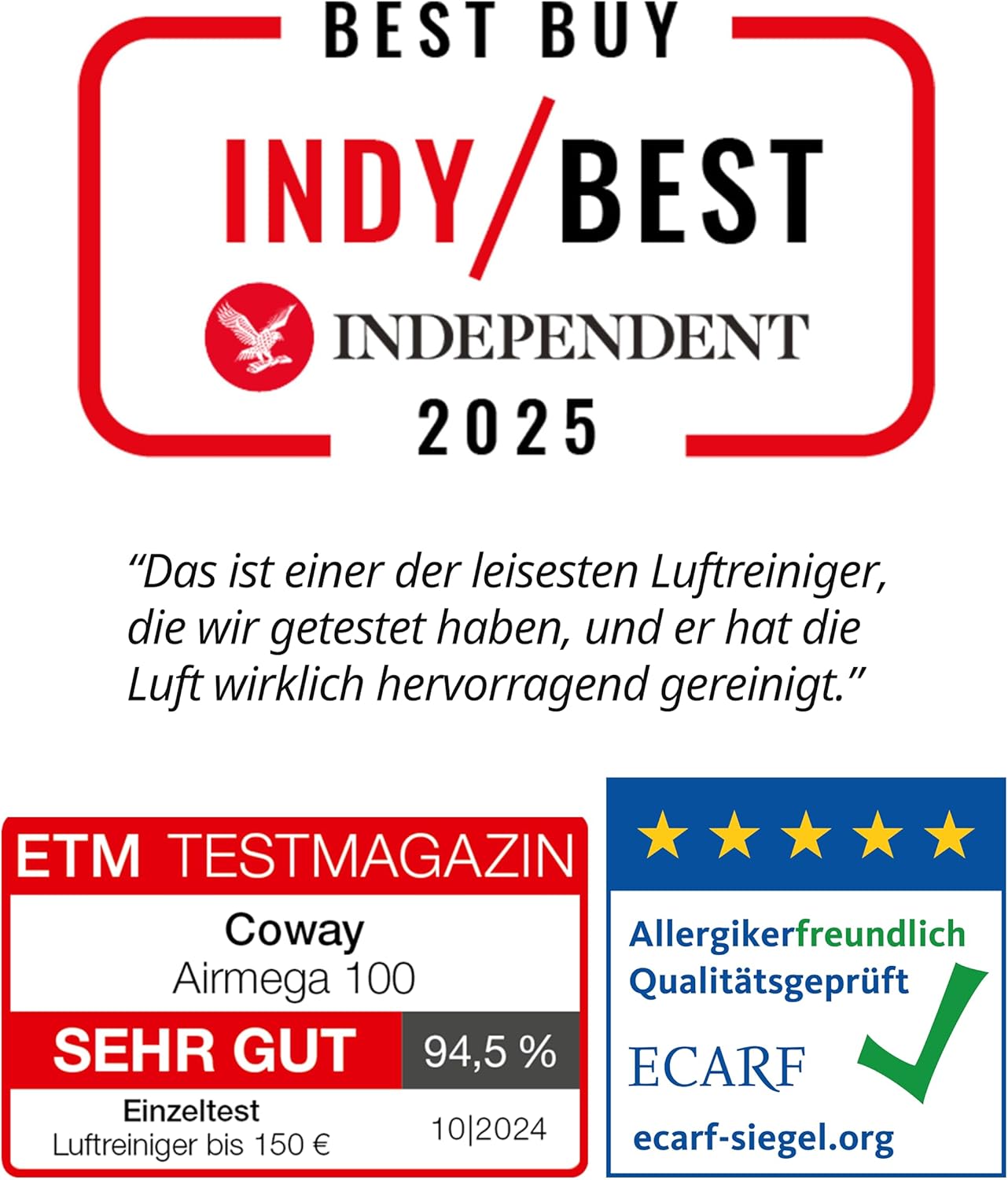 • Отлично качество - победител в Indybest 2025: Заради компактния си дизайн и висока производителност, моделът от 2025 г. беше награден с наградата „Най-добър пречиствател на въздух като цяло“ от IndyBest - първокласен избор за домакинства, които държат на стила.