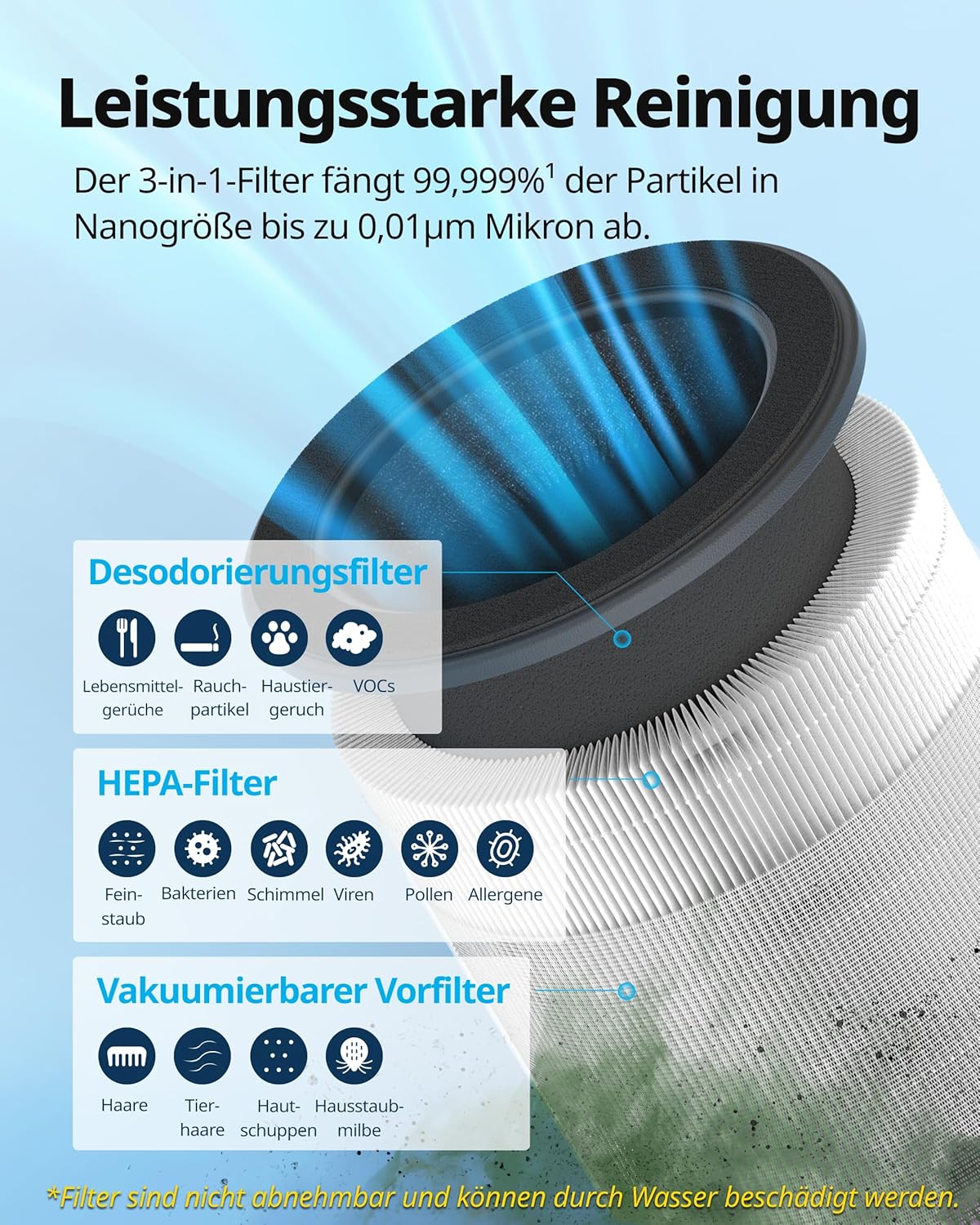 • Премахва 99,999% от ултрафините частици: Филтърната система HyperCaptive комбинира предфилтър, филтър за миризми и филтър за ултрафини частици. Тя премахва до 99,999% от частиците във въздуха с размер до 0,01 микрона - включително полени, фин прах и алергени - както и 99% летливи органични съединения и неприятни миризми.