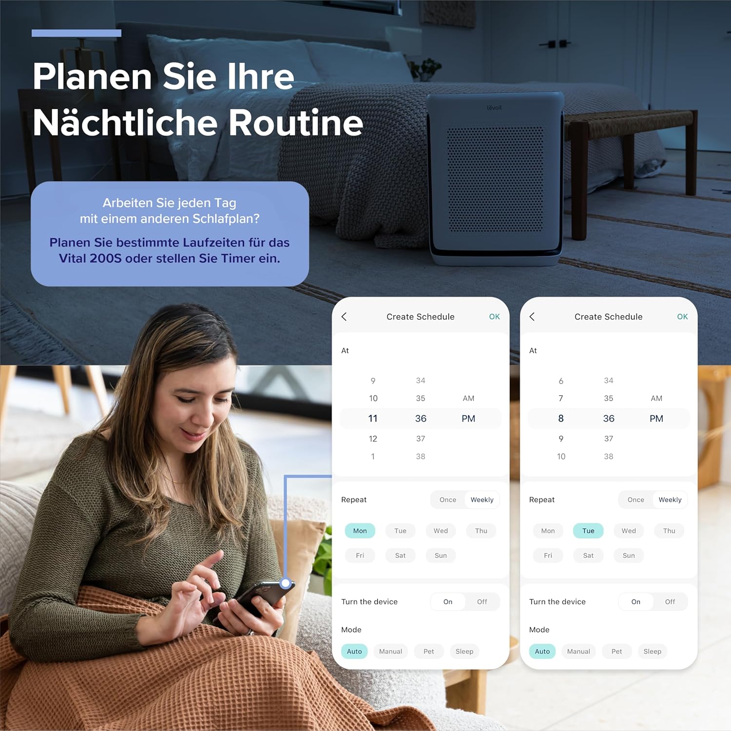 • Винаги и навсякъде: замърсяването на въздуха е един от скритите убийци на здравето, например цветният прашец и изгорелите газове от автомобилите: Очите сърбят, носът се подува, дишането е трудно, (хроничен) бронхит. Ако имате домашни любимци, можете да се сблъскате и с проблеми като козина и миризма от тях. Ако вие или вашето семейство пушите, димът в стаята е непоносим. Пречиствателят на въздух Levoit Core 300S е добро решение на горепосочените проблеми.