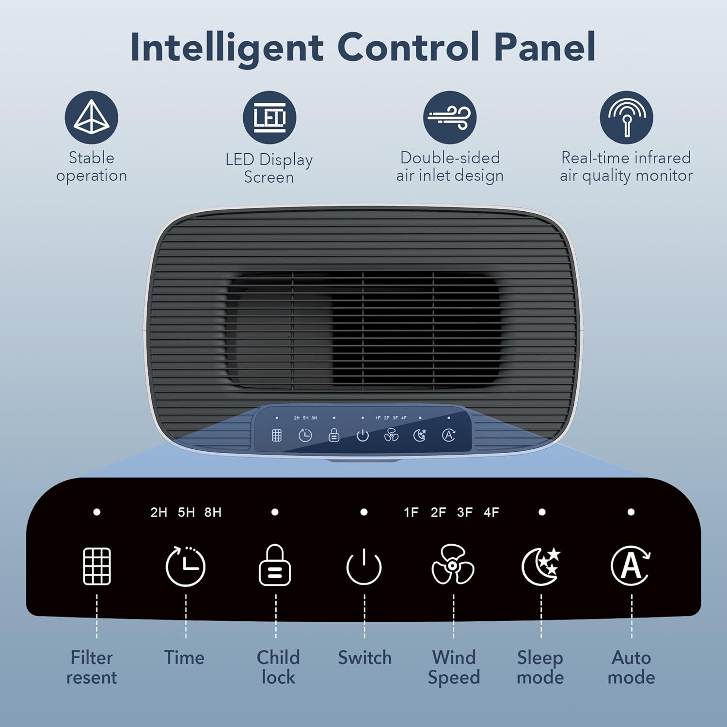 • PM 2.5 дисплей и сензор за качество на въздуха Пречиствателят на въздух за спалня Morneto HY4866 е оборудван с инфрачервен PM2.5 сензор, който следи качеството на въздуха в реално време и го показва на екрана. Когато пречиствателят на въздух е в автоматичен режим и околният въздух се помътни, екранът става жълт или червен, а вентилаторът ускорява въздуха, което го прави най-добрият пречиствател на въздух за дим от горски пожари. Позволете си да бъдете информирани за състоянието на въздуха по всяко време.