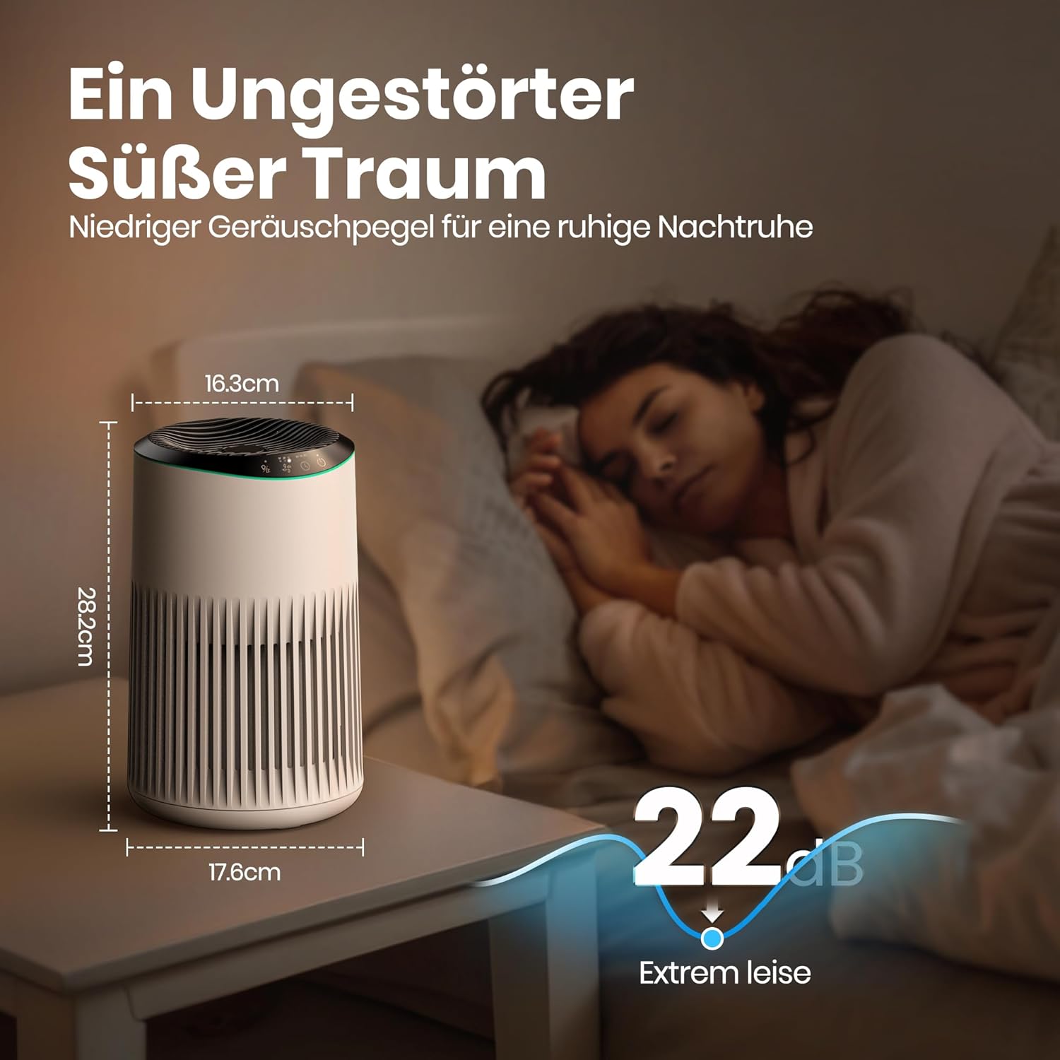 • 22 dB спокойствие: пречиствателят на въздух не само пречиства въздуха ви, но и подобрява атмосферата в стаята ви с вградена синя амбиентна светлина. Просто превключете в режим на заспиване и оставете меката светлина да избледнее след три секунди. С ултра тиха работа от само 22 dB, вие се потапяте в страната на сънищата в тиха, безсветла среда, която е идеална за спокоен сън.