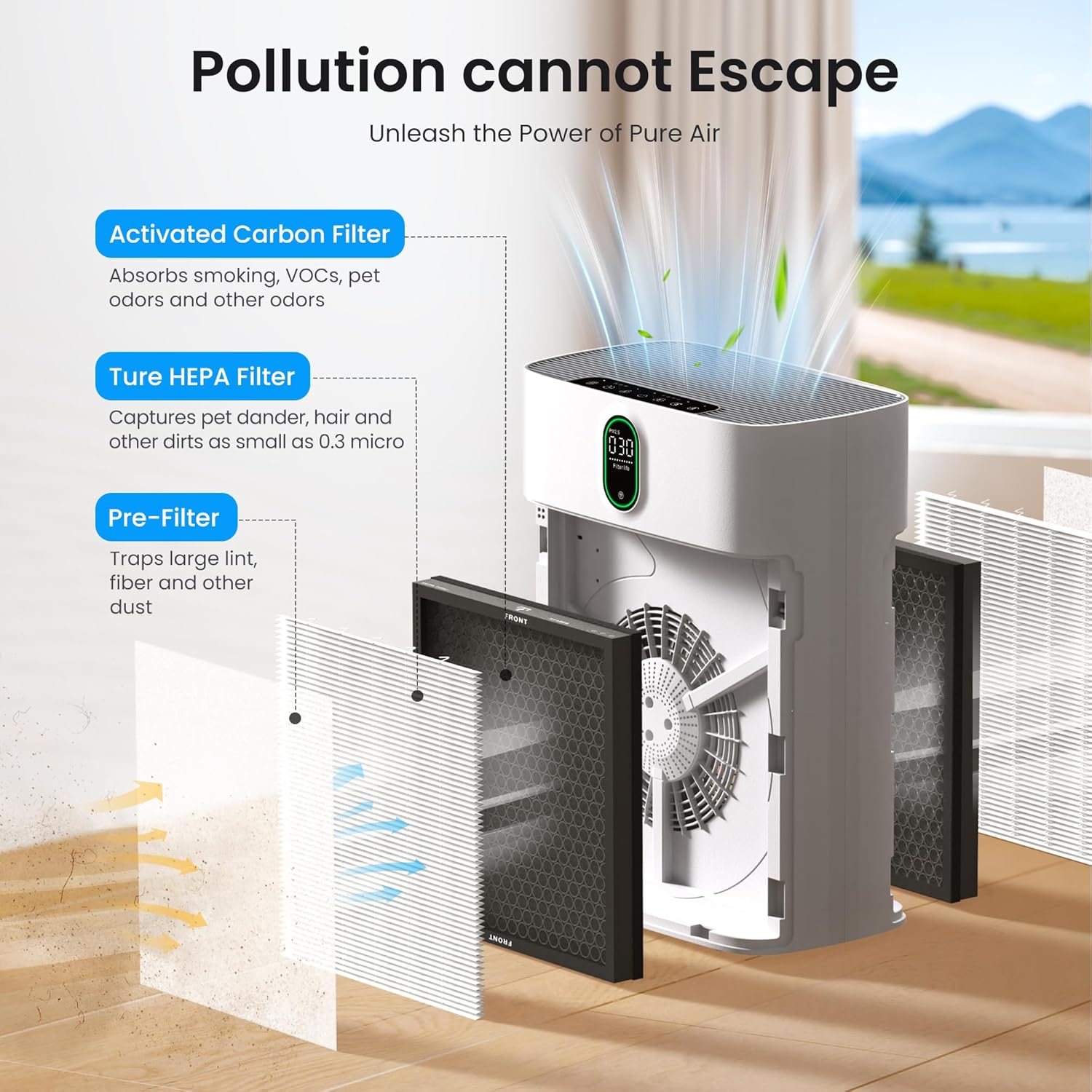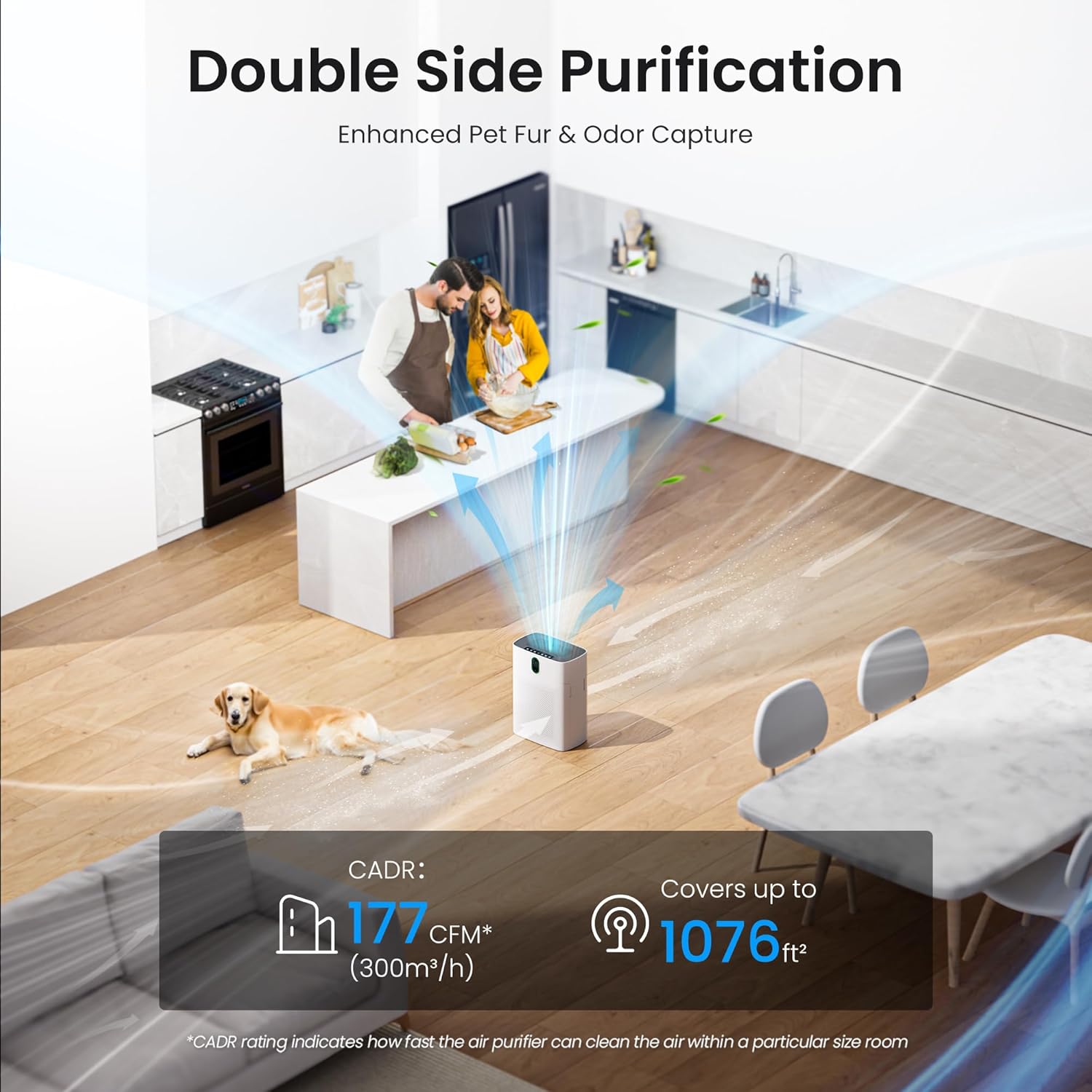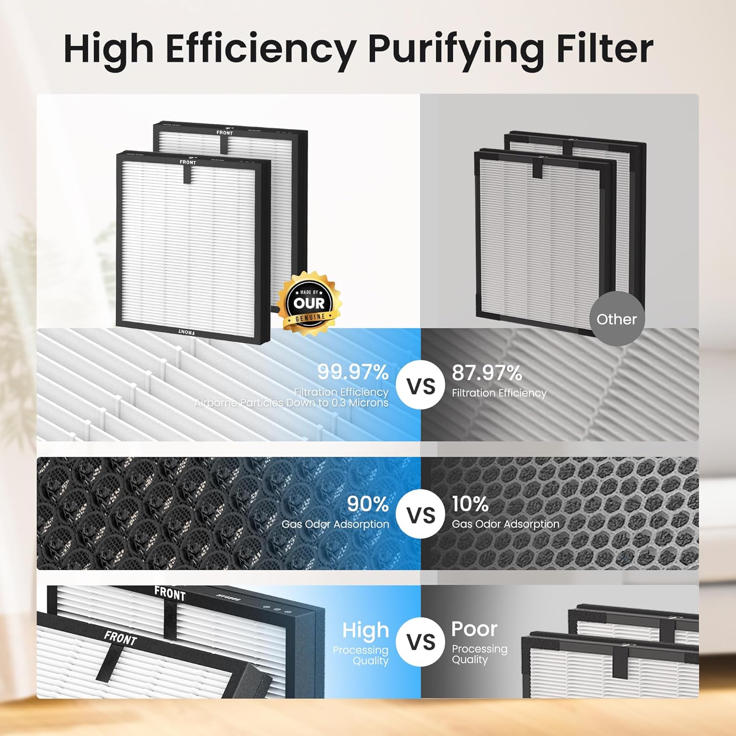 • ДВОЙНО ВСМУКВАНЕ И ВИСОКОЕФЕКТИВНА ФИЛТРАЦИЯ ЗА ИЗДРЪЖЛИВОСТ Оборудван с двоен всмукателен отвор и многослойна HEPA филтърна система, той почиства въздуха от двете страни едновременно, което значително подобрява ефективността на почистване. Интелигентният дисплей на устройството и приложението следят живота на филтъра в реално време и ви напомнят навреме, когато филтърът трябва да бъде сменен. Резервни филтри (обновена версия: B0BMDYDXFK; оригинална версия: B0C3GWNR29) се предлагат в Amazon и са лесни за подмяна.