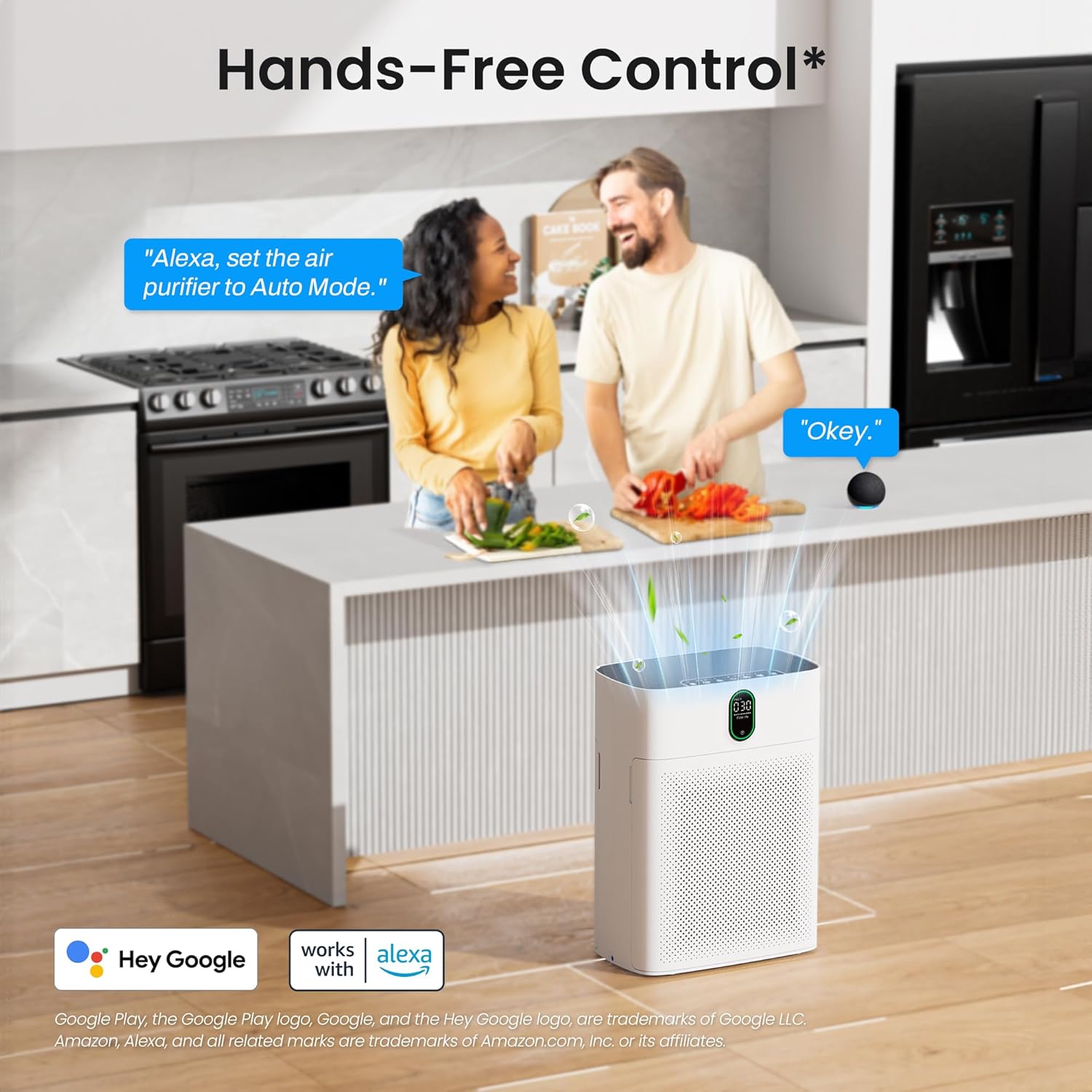 • Гласово контролирано взаимодействие за работа със свободни ръце. Съвместим с Amazon Alexa и Google Assistant, той позволява „работа със свободни ръце“ във всички сценарии. Просто давайте гласови команди, за да извършвате операции като проверка на качеството на въздуха и превключване на режима на работа, което прави управлението на пречистването на въздуха по-удобно и интелигентно.
