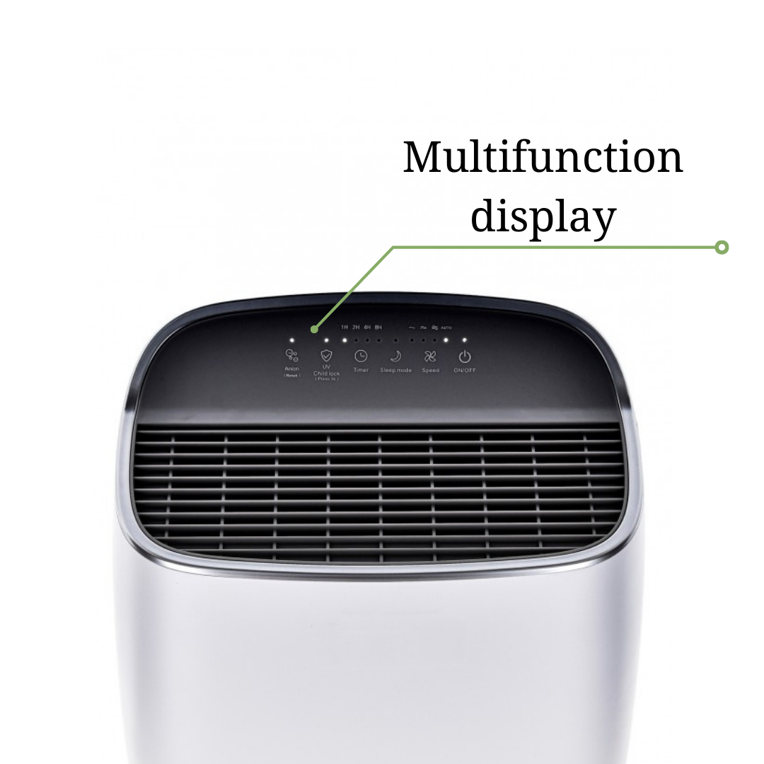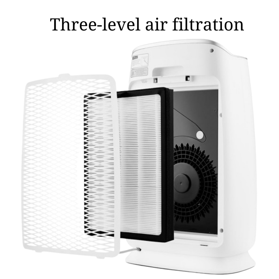Снабден с първичен мрежест филтър, който улавя по-големи частици като прах и косми, HEPA филтър клас H13, който премахва до 99,95% от частици с размер до 0,3 микрона, и филтър с активен въглен, който неутрализира вредни газове, алергени и бактерии, както и премахва неприятни миризми.