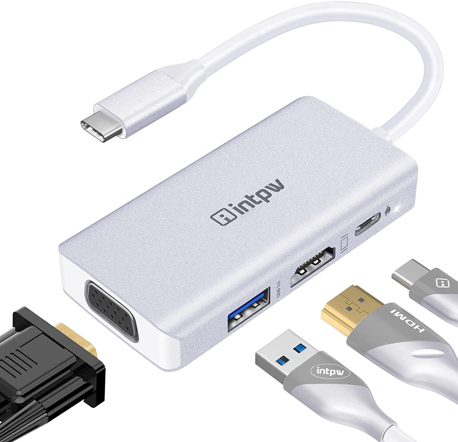 Преходник intpw, USB-C (м) към VGA (ж) / USB-A 3.0 (ж) / HDMI (ж) / USB-C (ж), 4K HDMI ,1080P VGA, Сив