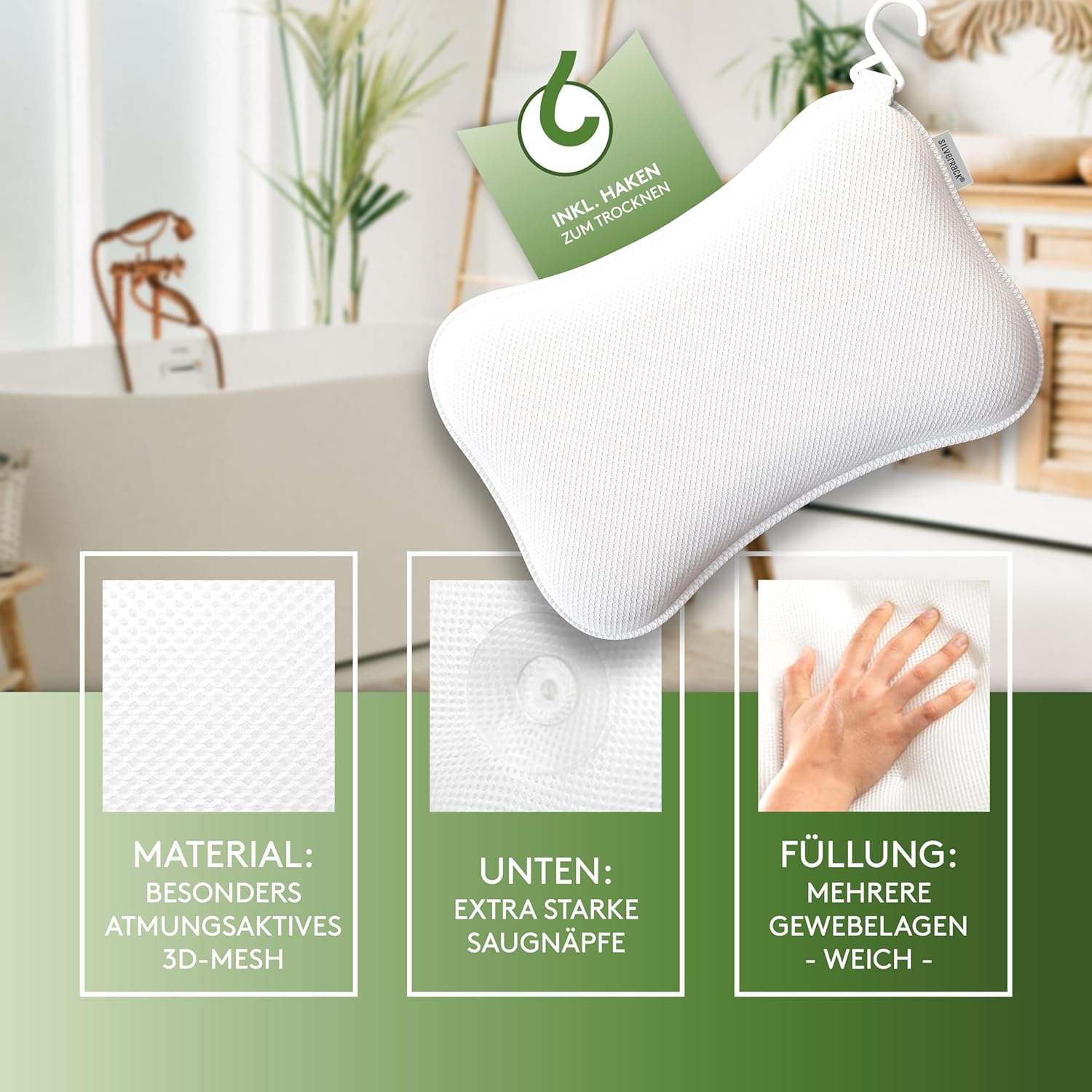 • Висококачествени материали – изработена от мека, дишаща 3D мрежа, тази възглавница за вана предлага приятна повърхност. Многослойният пълнеж осигурява допълнителен комфорт.
