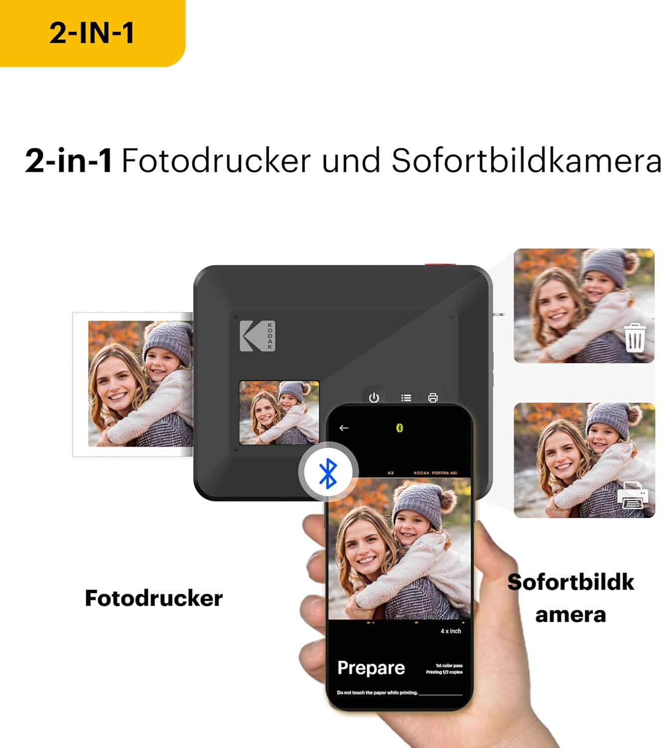 • Фотоапарат за моментално заснемане + фотопринтер - Kodak Mini Shot 3 Retro е цифров фотоапарат с вграден фотопринтер, който ви позволява да отпечатвате или отменяте снимките си след заснемане. С този фотоапарат за моментално заснемане можете също да отпечатвате снимки с размер 3" x 3" директно от галерията на мобилното си устройство чрез Bluetooth.