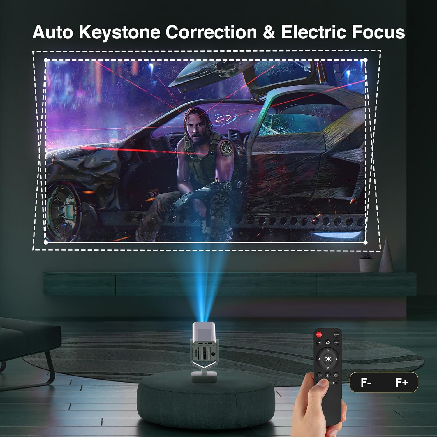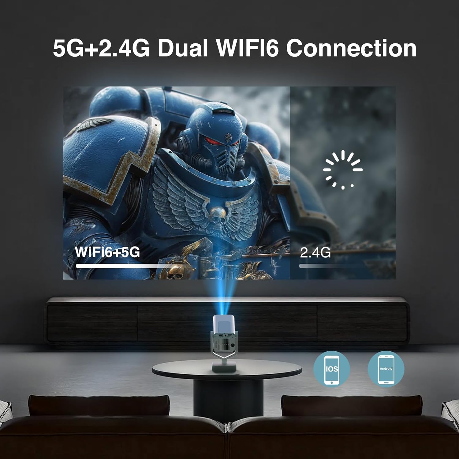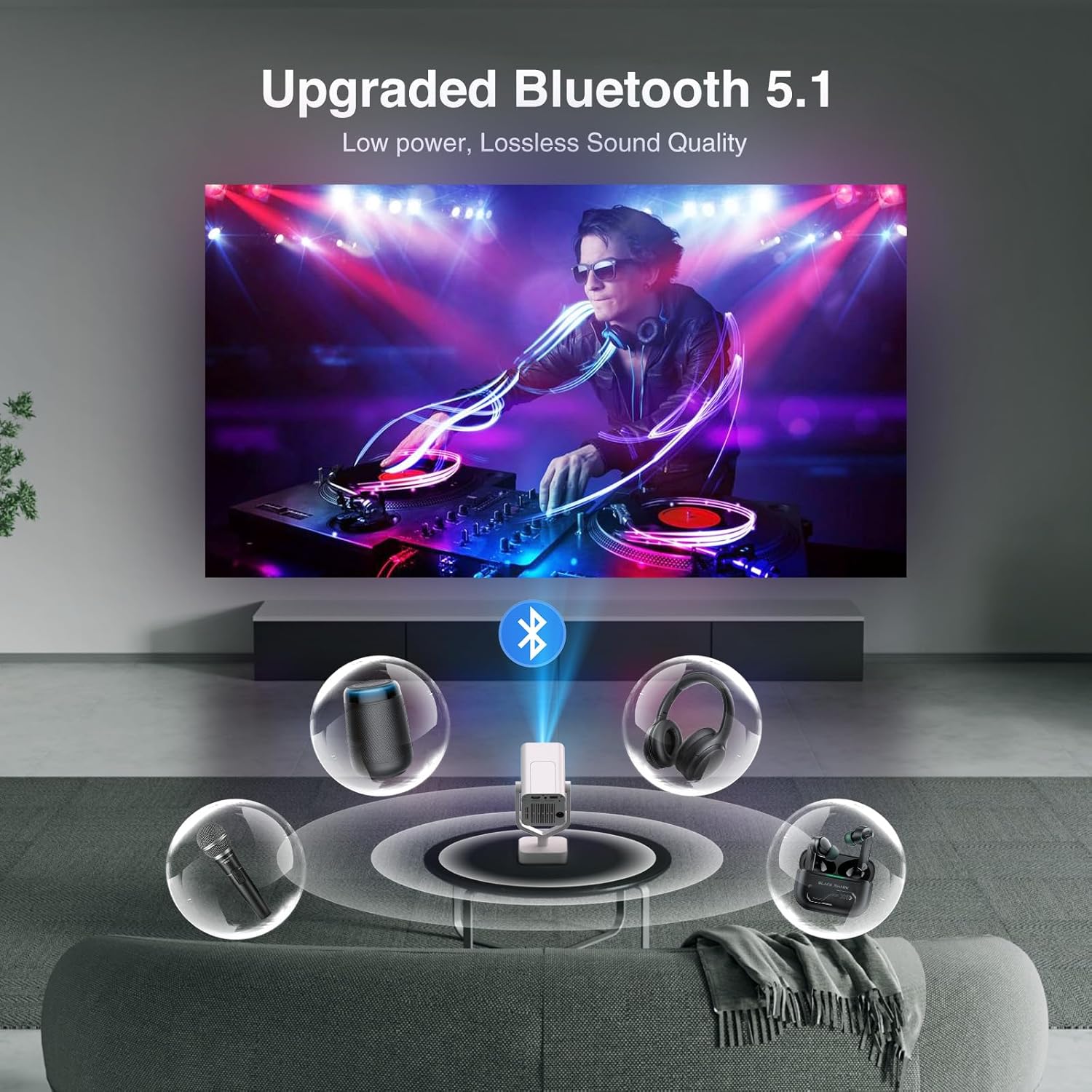 Преносим мини проектор - Full HD 1080P поддръжка | Корекция на трапецовидно изкривяване за автомобил | Завъртане на 270°, преносим проектор за домашно кино, Bluetooth, WiFi6, AKATUO, интелигентен видео проектор за телефон/телевизор/на открито