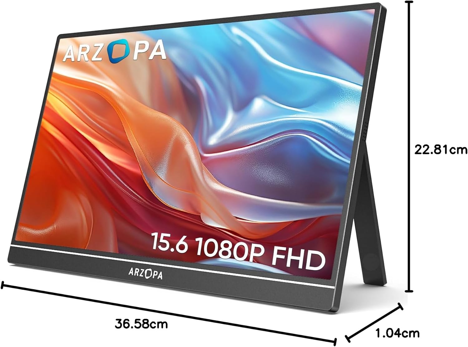Преносим монитор ARZOPA, 15.6-инчов 1920 x 1080 FHD IPS преносим монитор за лаптоп с една поддръжка ултра тънък втори екран за лаптоп/PC/Mac/PS3/4/5/Xbox - USB C и HDMI порт - A1