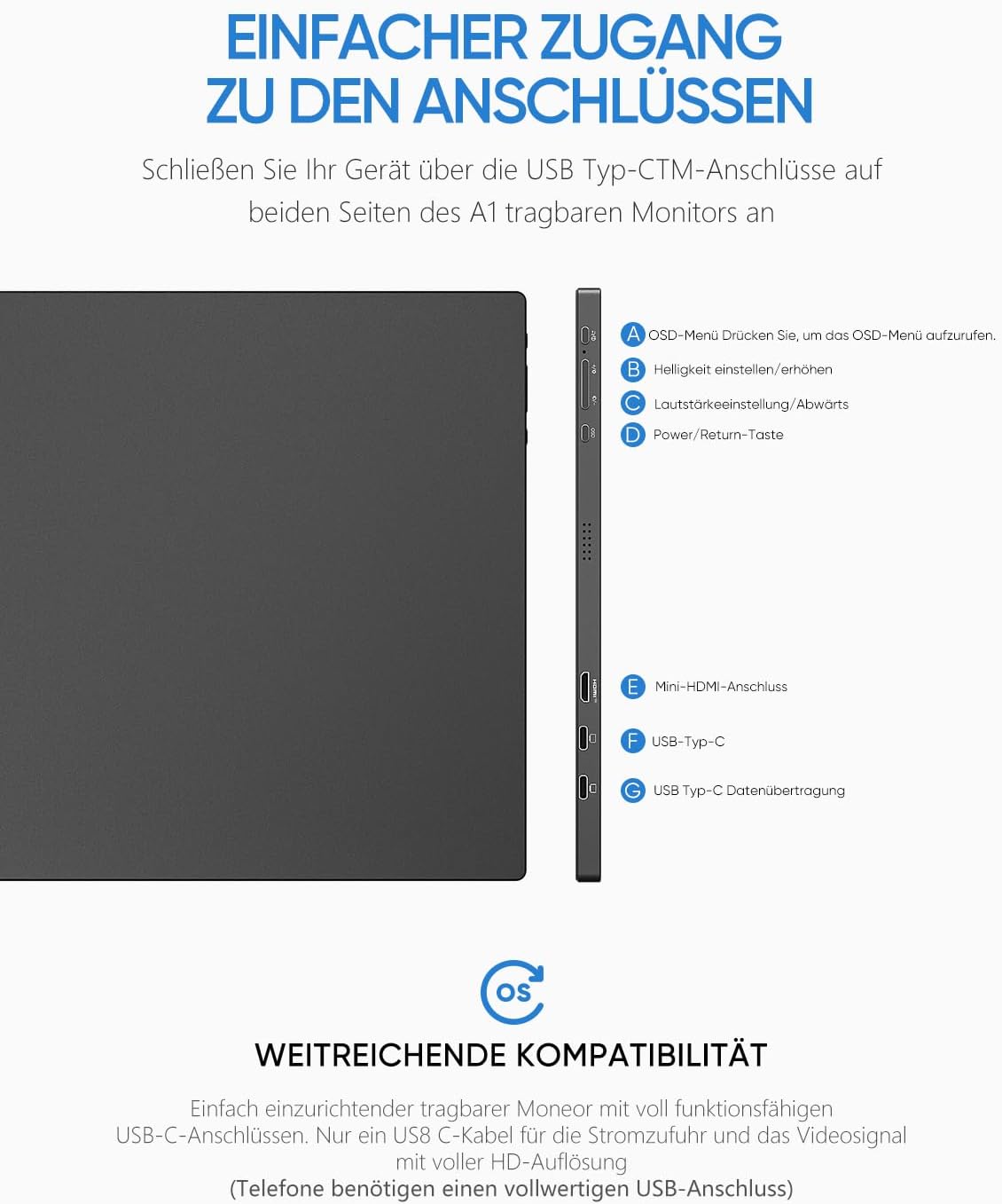 • [Full HD 1080P IPS екран] Преносимият IPS екран осигурява пълен ъгъл на видимост от 178°. Контрастното съотношение 1000:1 осигурява точно и ярко изображение.