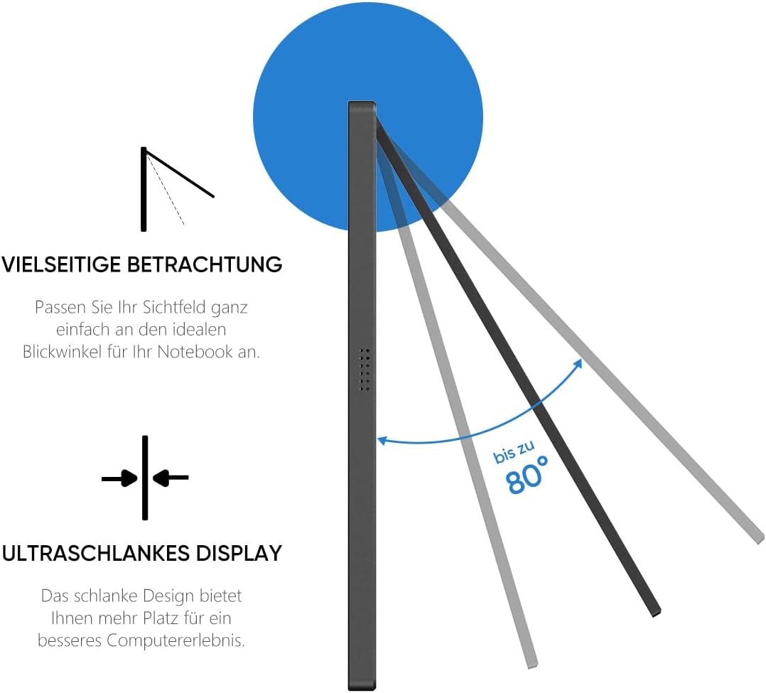 • Ултратънък дизайн: Тегло на преносимия монитор ARZOPA 15,6 инча: 1,63 фунта, дебелина отгоре 0,2 инча, дебелина отдолу 0,35 инча. Теглото му е почти половината от това на лаптоп със същия размер. Можете да го поставите в чантата си за компютър заедно с лаптопа.