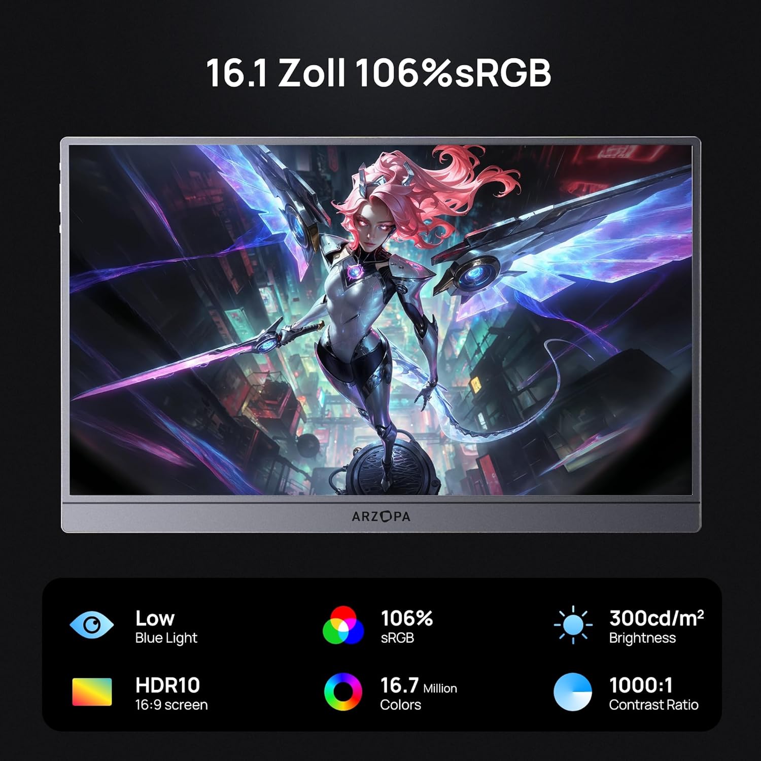 • [Full HD 1080P IPS екран] Преносимият IPS екран осигурява пълен ъгъл на видимост от 178°. Контрастното съотношение 1000:1 осигурява точно и ярко изображение.