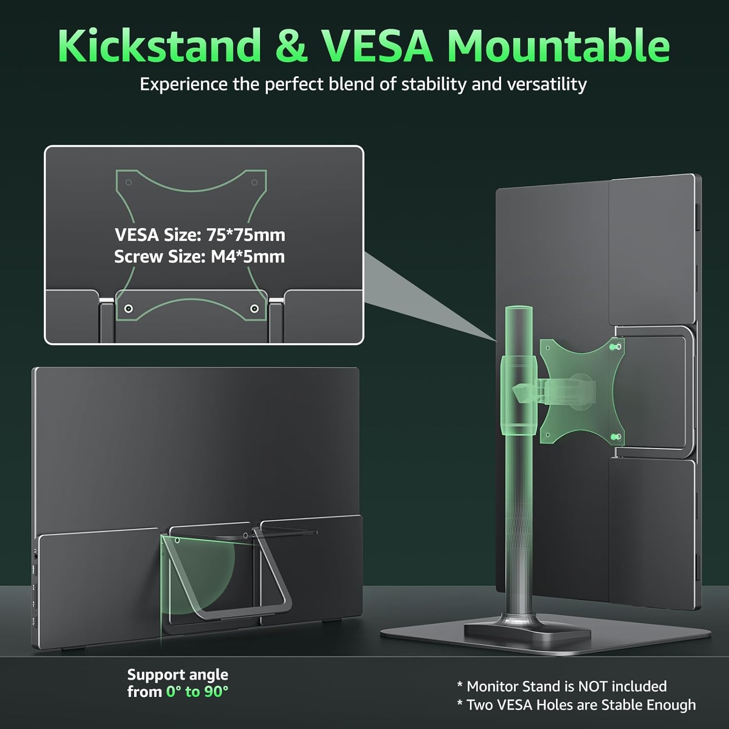 • РЕГУЛИРУЕМА СТОЙКА И VESA СТОЙКА - преносимият компютърен монитор cocopar е лесен за настройване. С вградената стойка, регулируема на 90°, можете да регулирате позицията и ъгъла индивидуално. Освен това, 2-та VESA отвора позволяват стабилно закрепване към съвместими стойки за ефективно използване на пространството. Персонализирайте работното си пространство за по-голяма продуктивност.
