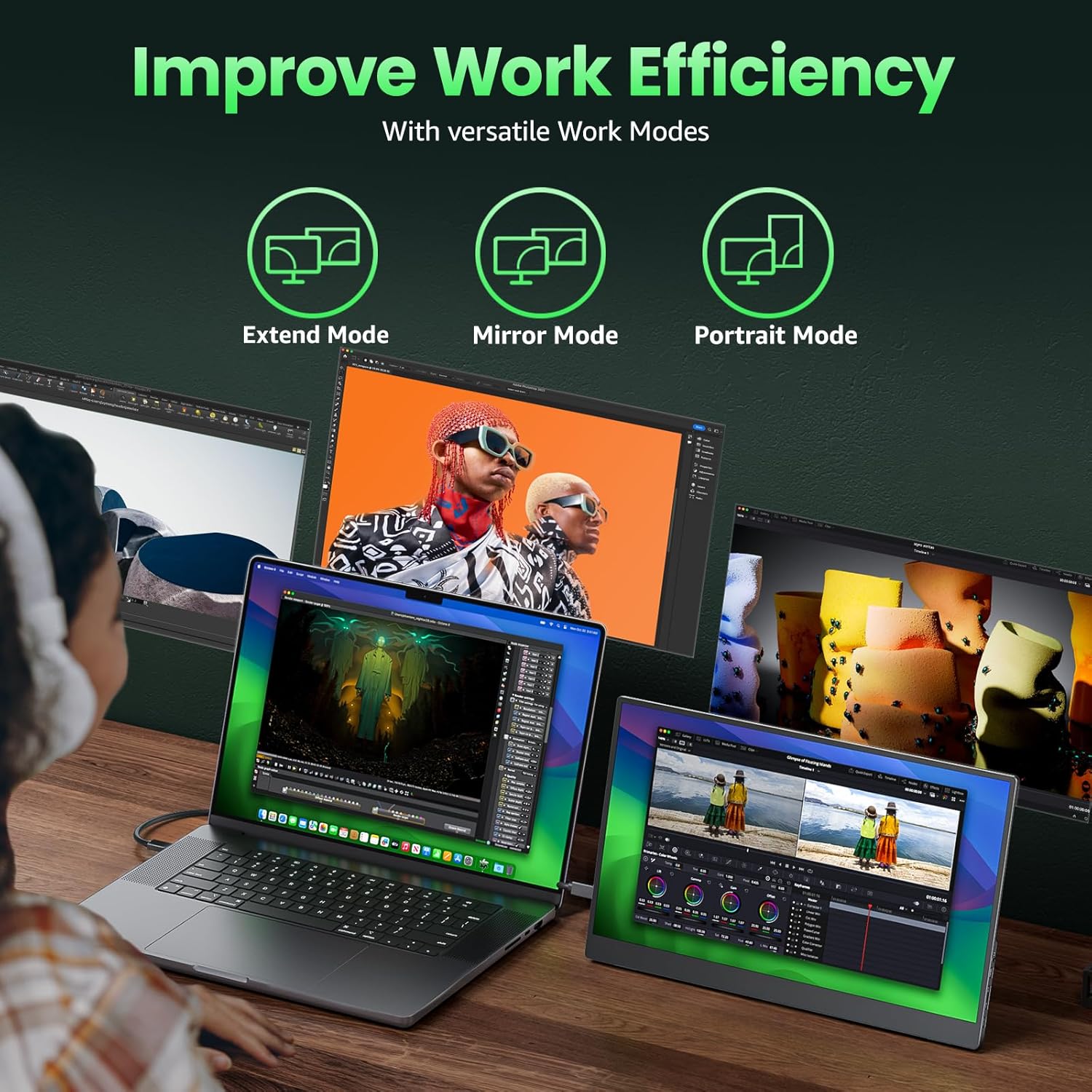 • Преносим FHD монитор с VESA монтаж: оборудван с резолюция 1080P, 60HZ, 85% цветова гама, пълен ъгъл на видимост 178°, HDR и супер ясен IPS екран A-клас с ниска синя светлина, този 15,6-инчов преносим екран за лаптоп Cocopar е с дебелина само 4 мм в най-тънката точка и тегло 680 г.