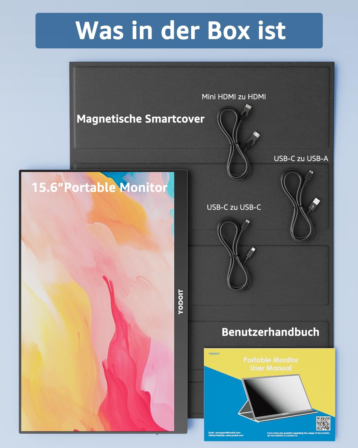 Преносим монитор Yodoit, 15.6-инчов 1920 x 1080P FHD преносим IPS дисплей с USB Type C и HDMI връзка и вграден високоговорител, екран за грижа за очите за компютър, лаптоп, Xbox, PS 3/4/5, Switch и телевизор