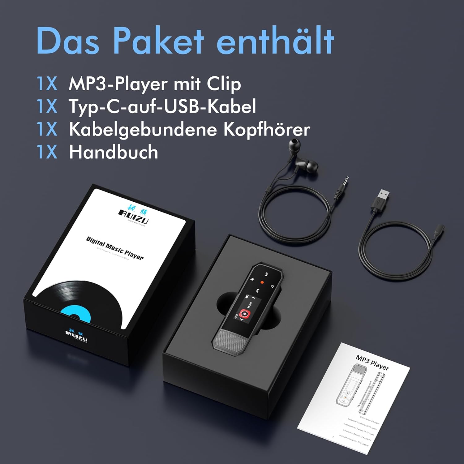 1 x Ruizu Bluetooth MP3 player with clip, 1 x Type-C to USB cable, 1 x wired headphones, 1 x manual (English language not guaranteed)