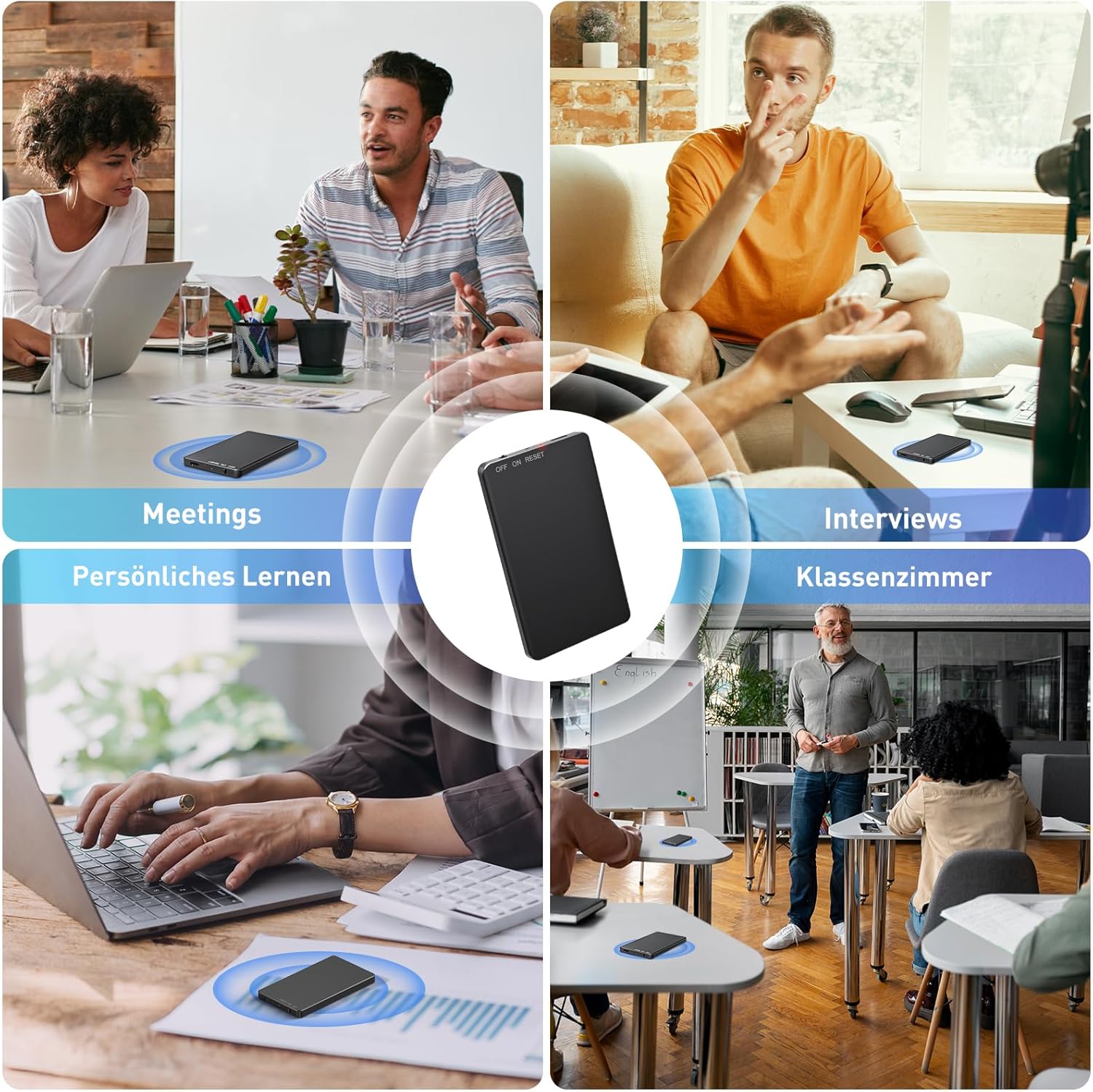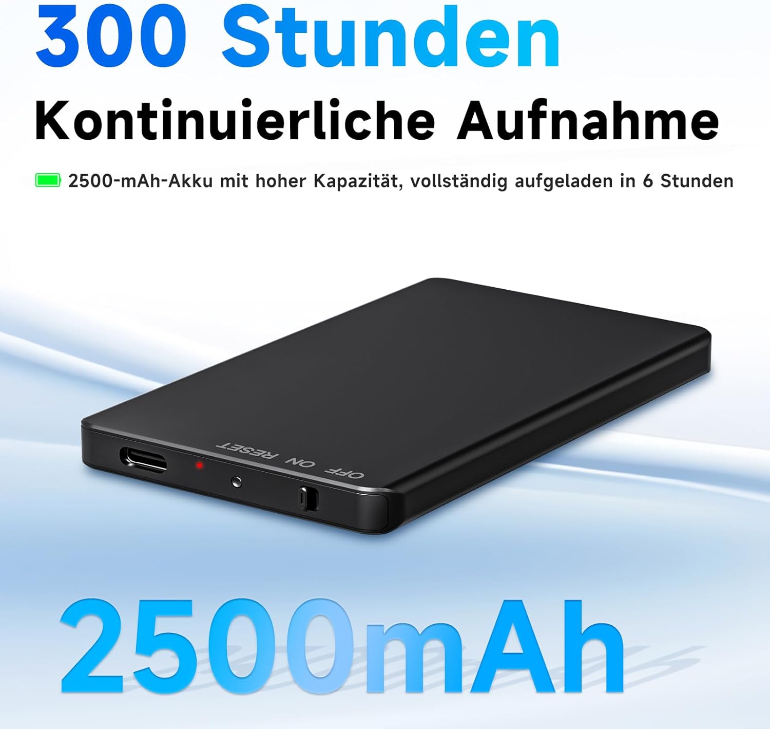 • 300 часа живот на батерията + сегментиран запис: Оборудван с батерия от 2500 mAh с голям капацитет, която поддържа бързо зареждане Type-C и може да издържи до 300 часа след пълно зареждане за 6 часа, което напълно елиминира притесненията за батерията. Лесно се справя с целодневни срещи, многодневни интервюта или непрекъснати уроци. По подразбиране отделен файл със запис се създава автоматично на всеки 2 часа, всички записи се архивират ясно по дата и час, намирането и възпроизвеждането са супер удобни!