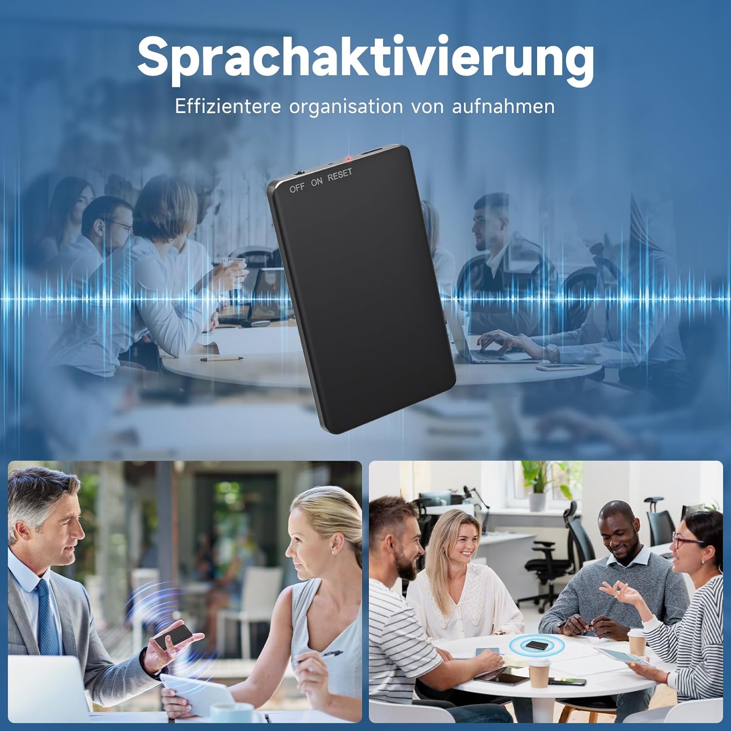 • Запис с един бутон + лесно управление: Просто плъзнете бутона до "включено", записът започва автоматично след 5 секунди закъснение, а плъзгането до "изключено" съхранява записи с 1536-32 kbps. Файлът със запис автоматично се именува с дата и час, което улеснява управлението му на компютър или мобилен телефон. Файлът със запис автоматично се именува с дата и час, което улеснява управлението му на компютър или мобилен телефон, а включените слушалки позволяват директно възпроизвеждане на записа.