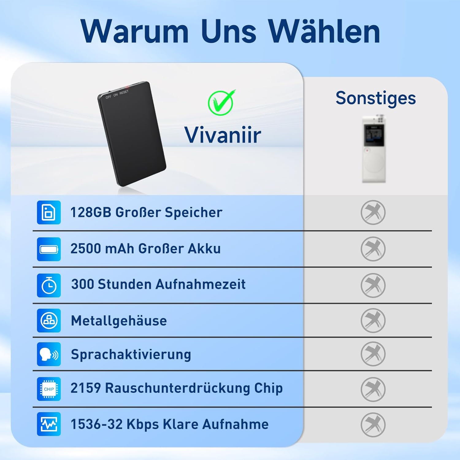 • Внимателно обслужване на клиенти: Vivaniir е надеждна марка в индустрията и предлага 24-часово обслужване на клиенти + доживотна техническа поддръжка, за да гарантира, че ще получите помощ по време на употреба. Съдържание на кутията: 1 x 128 GB диктофон, 1 x USB-C кабел, 1 x слушалки, 1 x ново вградено дистанционно управление, 1 x къс двоен Type-C кабел и 2 x ръководства
