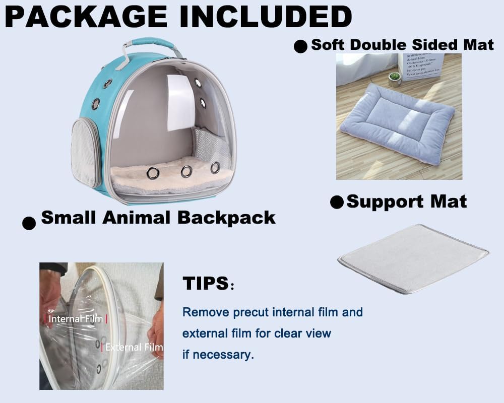 • Правоъгълната двустранна постелка е удебелена и гладка, много удобна с мек къс плюш. Раницата е достатъчно просторна за морско свинче, катерица, папагал, заек, брадат агама, гущер, костенурка, кълбовиден питон, патица, захарен лидер и др. малки животни.