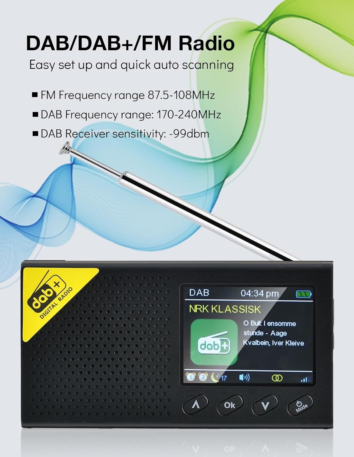• DAB радио [Най-ново DAB/DAB+/FM цифрово радио I] -- Мощният неодимов драйвер, интегриран в нашето малко DAB Plus радио, гарантира силно и висококачествено възпроизвеждане на звука. Поддържа DAB/DAB+ / FM (87.5 - 108 MHz) / RDS. Цифровото радио може да търси всички налични канали. Така че можете да се наслаждавате на любимите си радиостанции навсякъде.