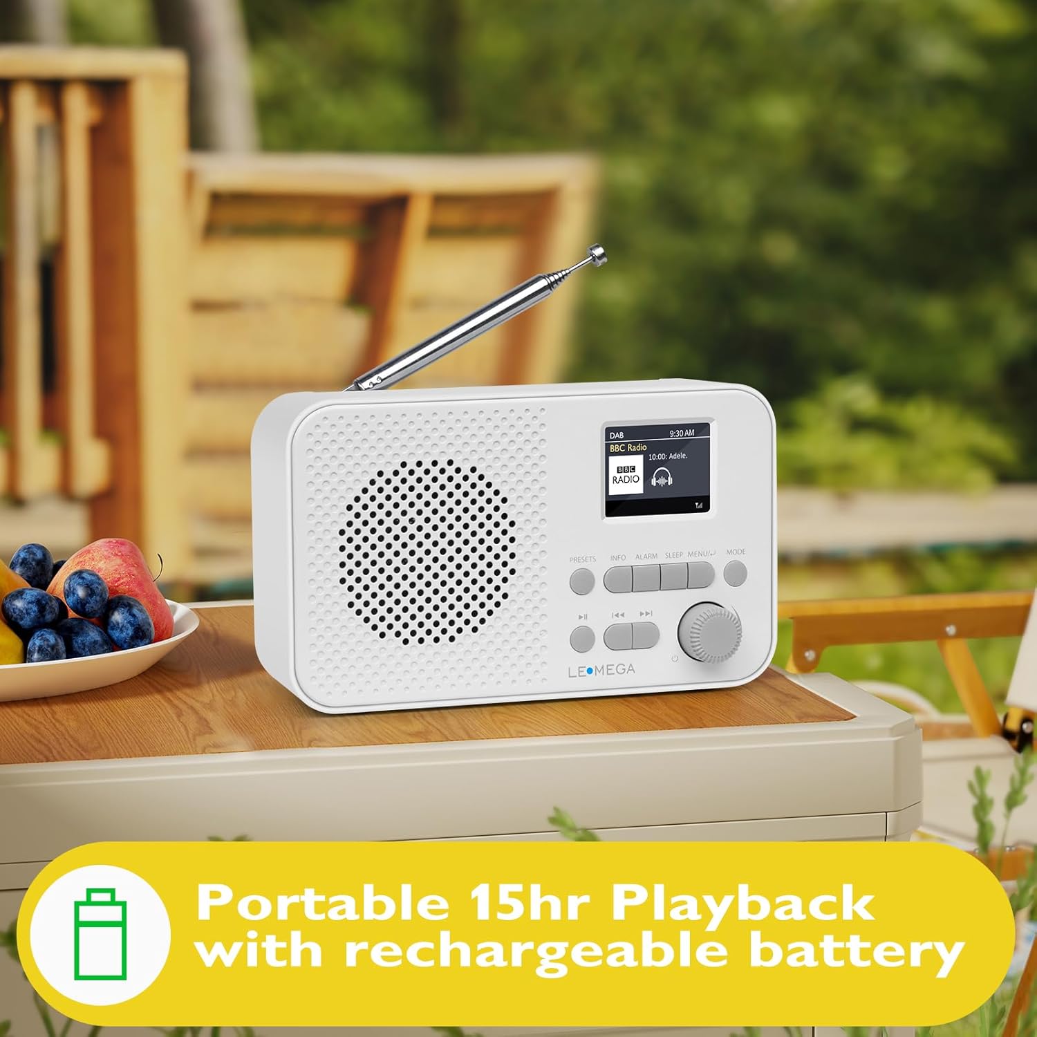 • Лесно за почистване и употреба: Пускайте любимите си цифрови и FM радиостанции навсякъде с дълго време на възпроизвеждане от 15 часа, напълно преносимо с акумулаторна батерия като градинско радио или радио за баня. Използвайте го у дома като кухненско радио, нощно радио или в хола с включения захранващ щепсел и изключително дълъг кабел за всяко място.