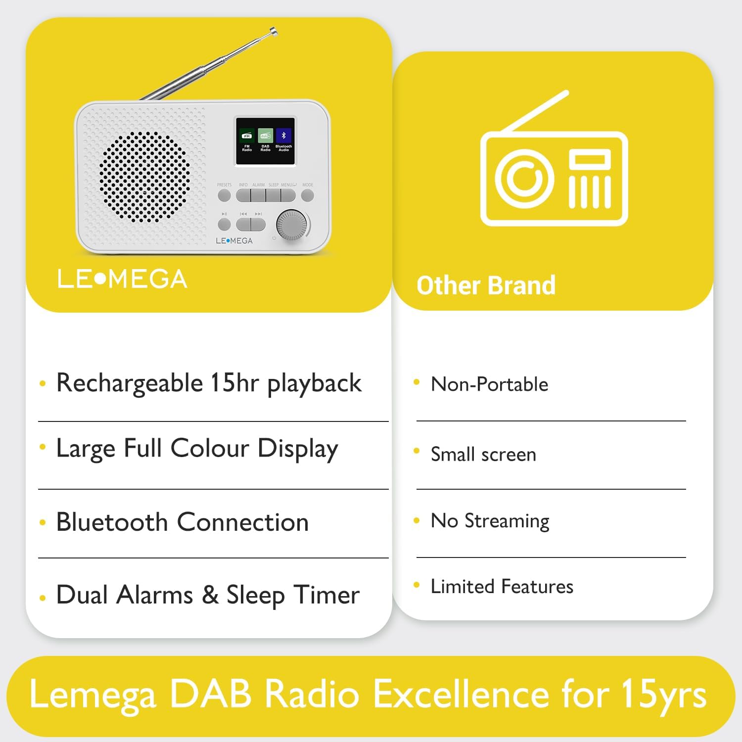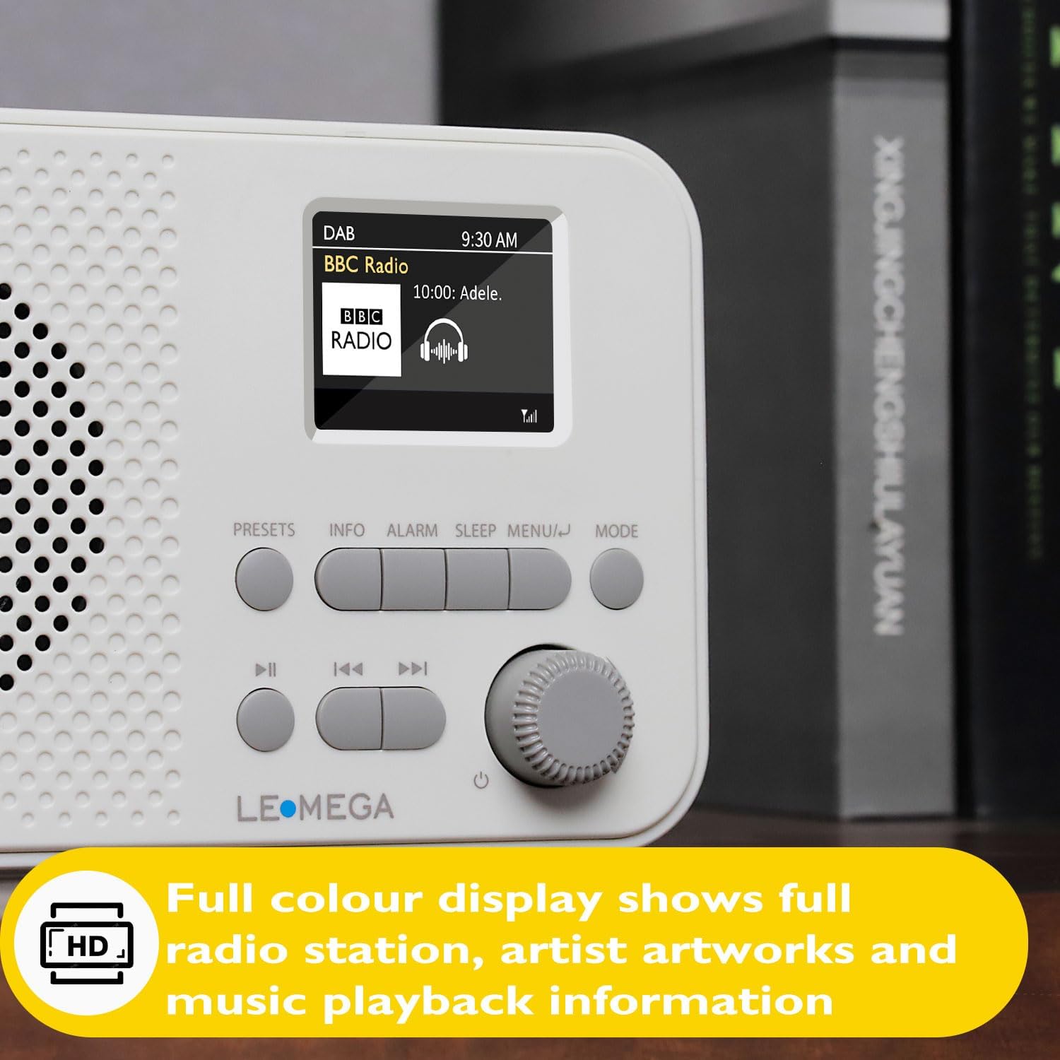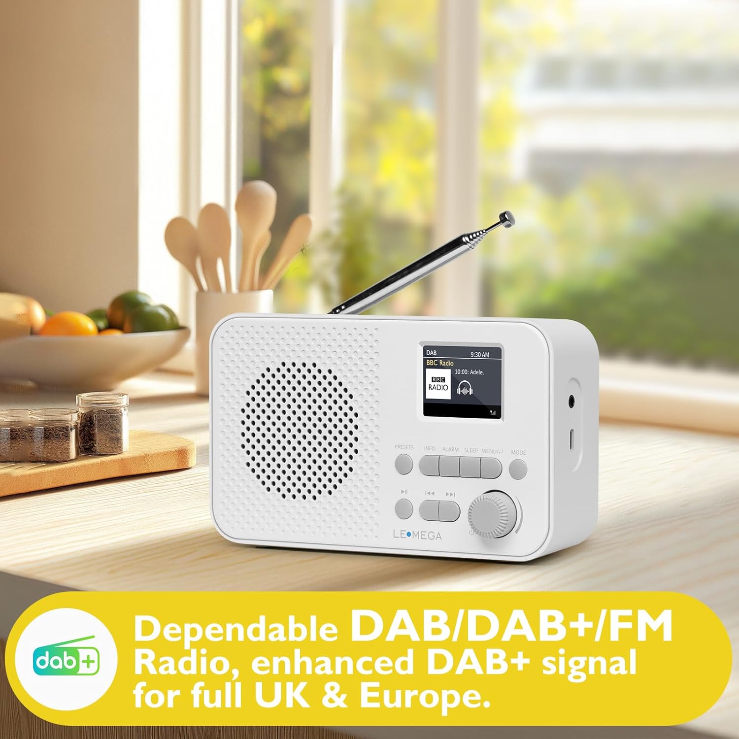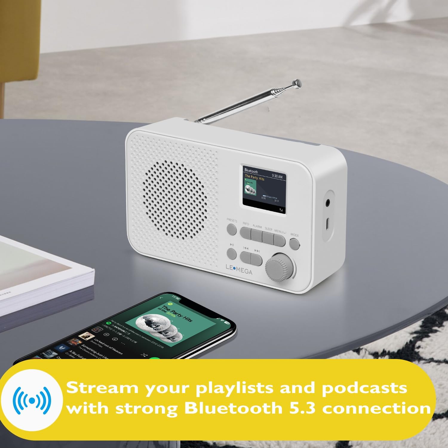 Преносимо DAB+ радио с Bluetooth, акумулаторна батерия с 15 часа време за възпроизвеждане или работа от електрическата мрежа, цветен дисплей, малко DAB радио с будилник, FM, 40 предварително зададени станции, жак за слушалки LEMEGA