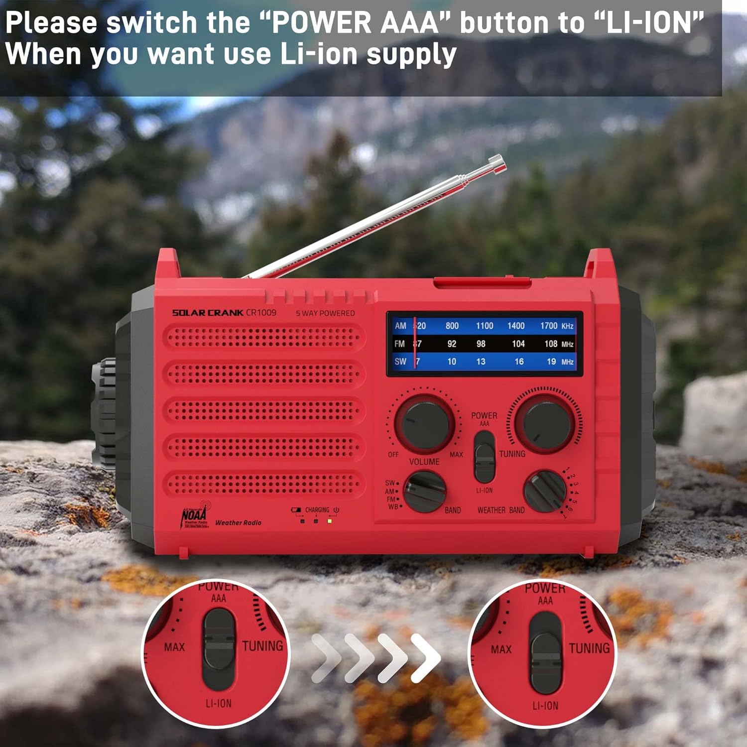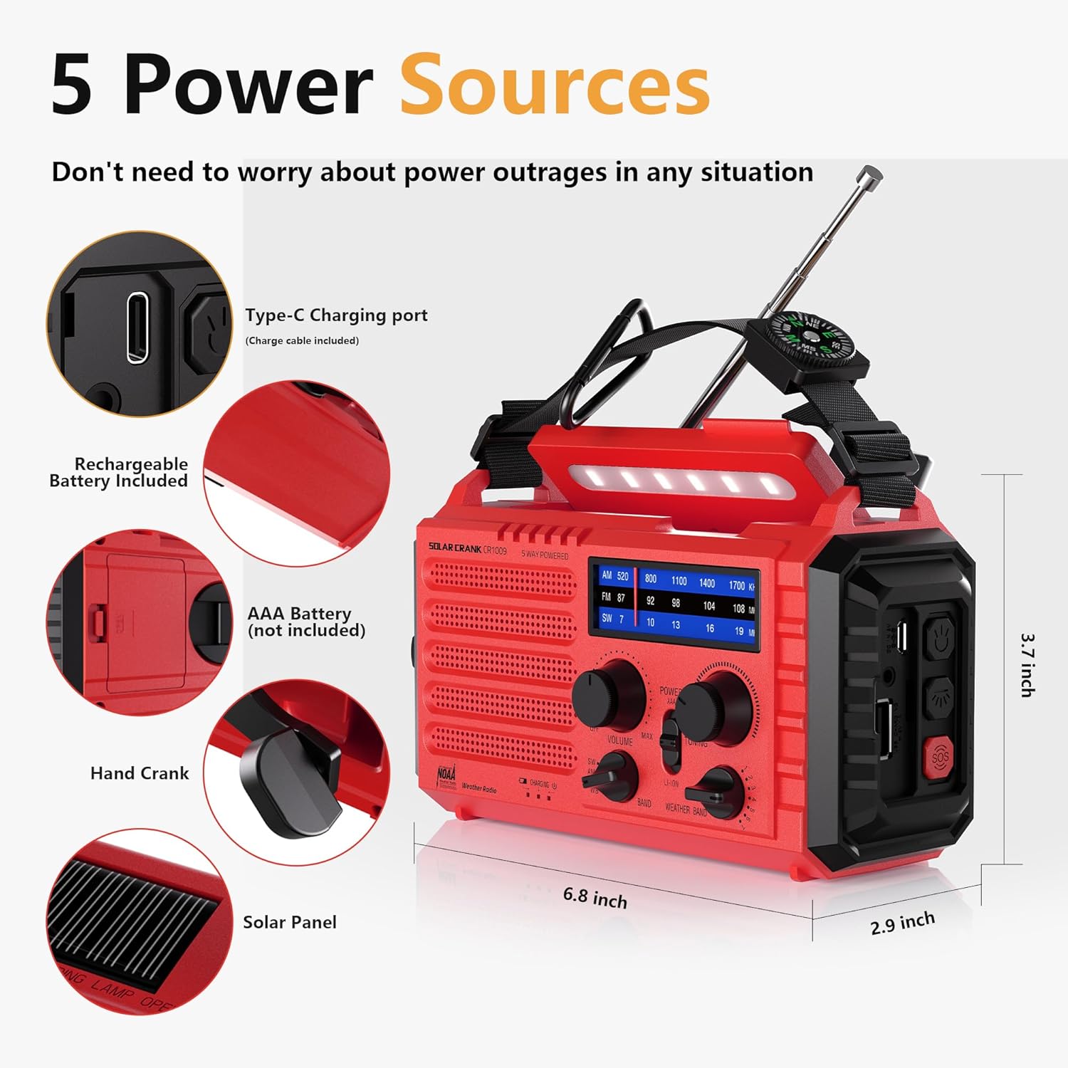 Designed for emergency situations, offers different methods to power yourself: Solar field, hand crank, rechargeable 4000 mAh battery, 5 V USB input, 3 AAA batteries to keep you up to date!
