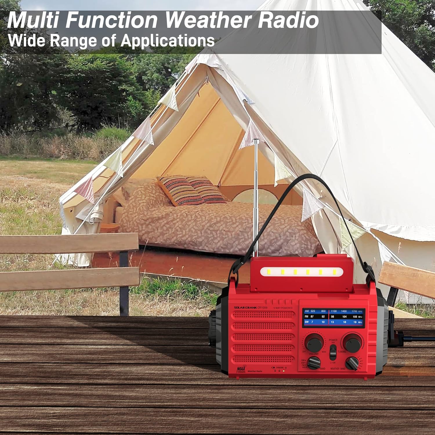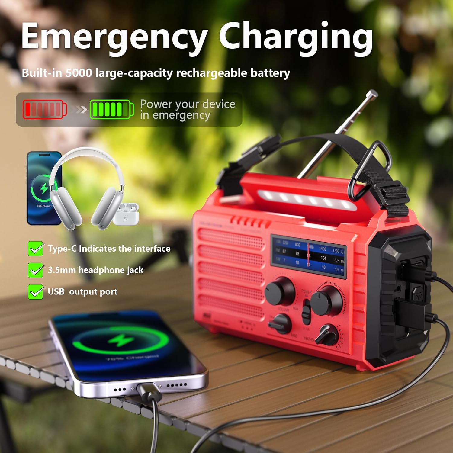 Portable emergency radio for emergency preparedness applications, indoor domestic use or outdoor emergencies such as camping, backpacking and travel. It also helps you stay up to date in storms such as floods, tornadoes, thunderstorms and other warnings.