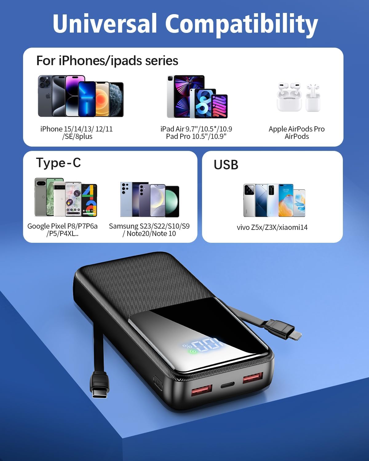 • Вградени 2 кабела за данни: Тази външна батерия се предлага с два различни вида кабели за данни, подходящи за почти всички потребители на USB-C и iPhone. Изработена от висококачествени TPE и PVC материали, тя предотвратява заплитането и скъсването на кабелите. С вградените кабели, кажете сбогом на разхвърляните кабели и се насладете на безпроблемно зареждане.