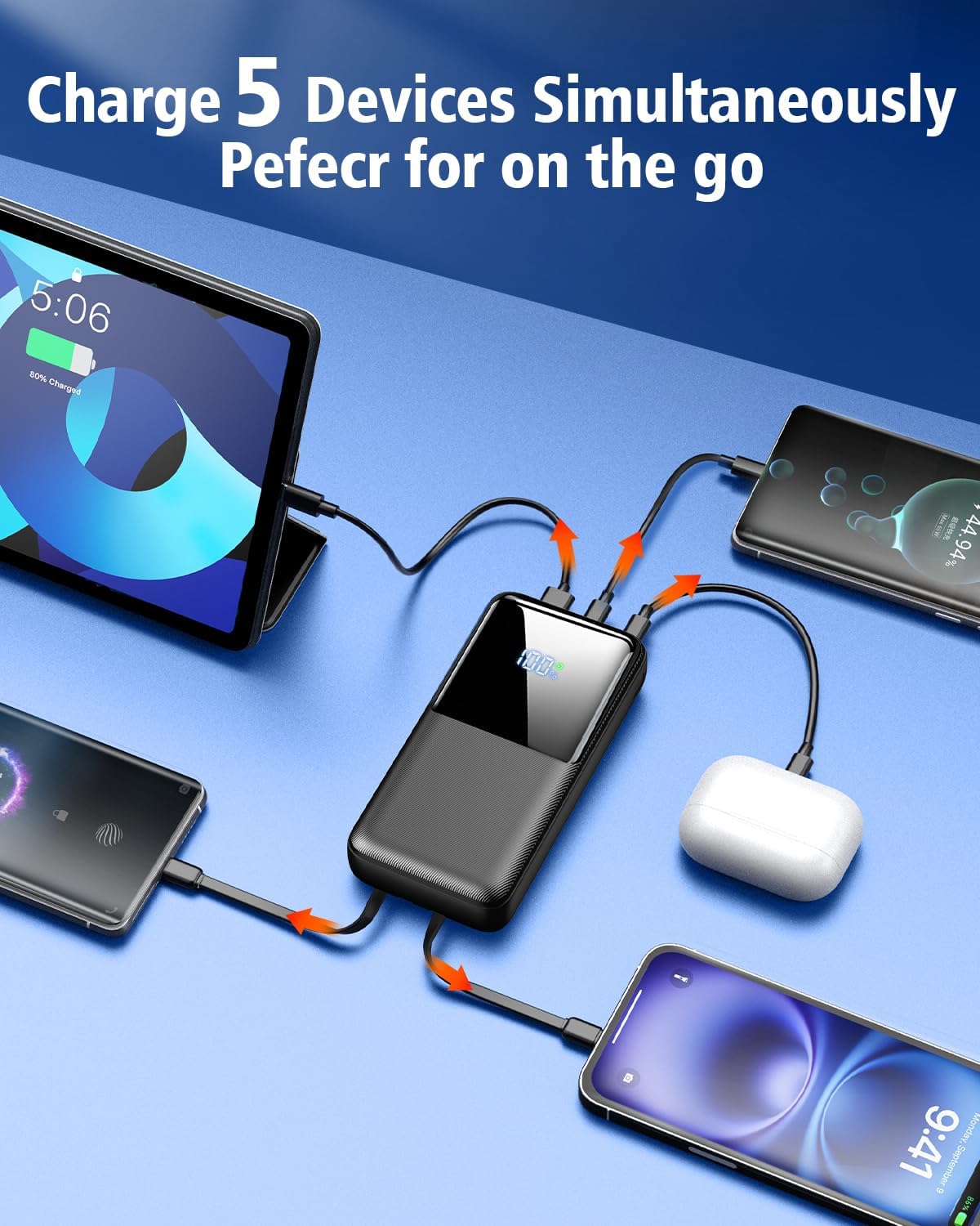 • До 4 устройства едновременно: Външната батерия PB-08 е оборудвана с 2 кабела (Type-C и iOS) и 3 порта (USB-A, Type-C, Micro), така че можете да зареждате до 4 устройства едновременно. Край на заплетените кабели или множеството зарядни устройства - насладете се на удобно зареждане за вас и вашите приятели!