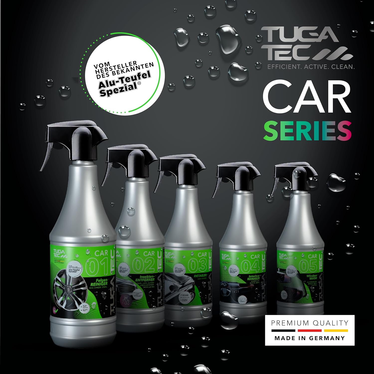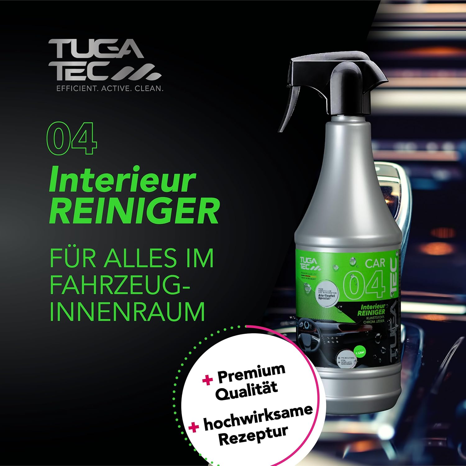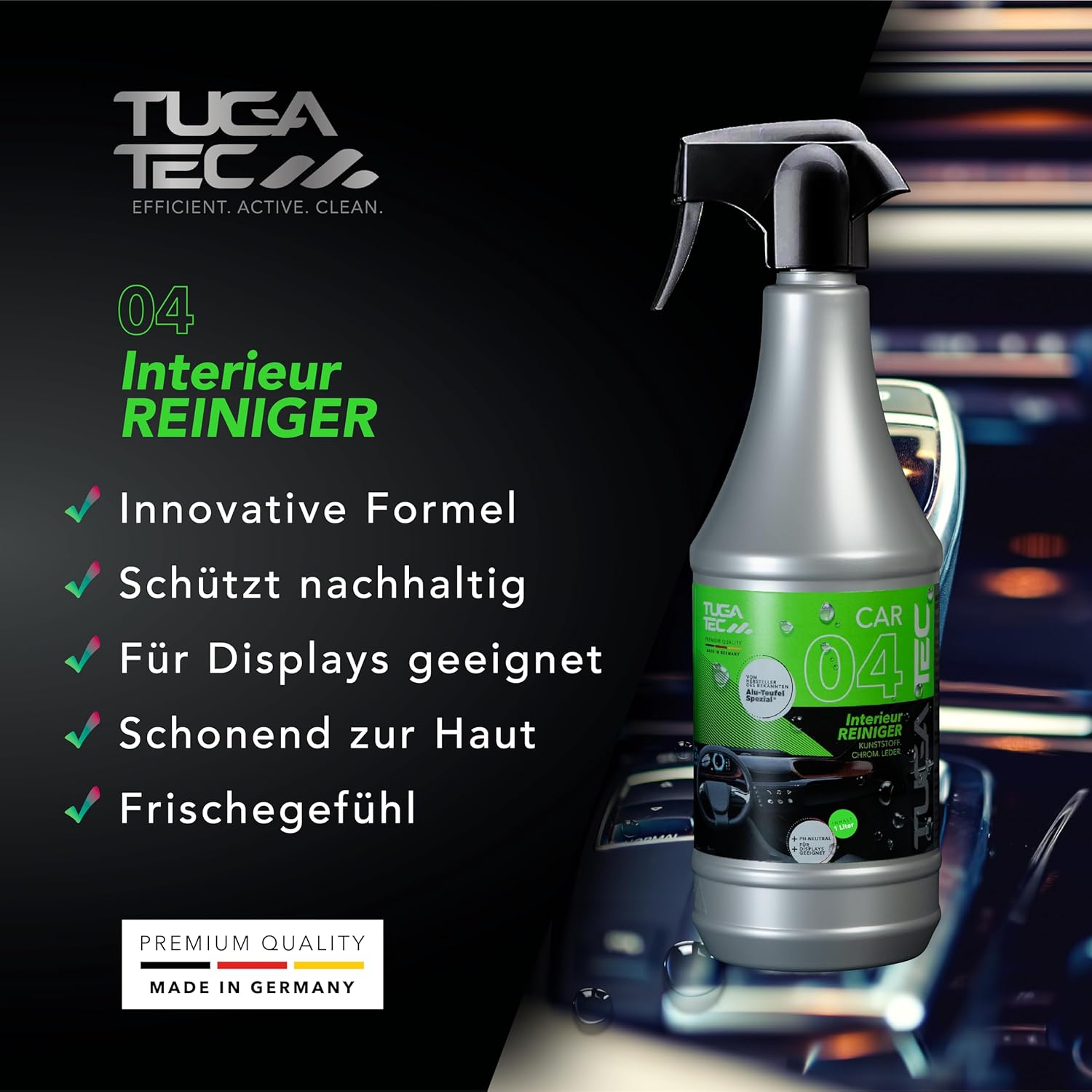 • Произведено в Германия – Качество за изискани първокласни почистващи препарати за интериор от TUGA Chemie – разработени за високи изисквания за грижа за автомобила, безопасност и съвместимост с материалите.