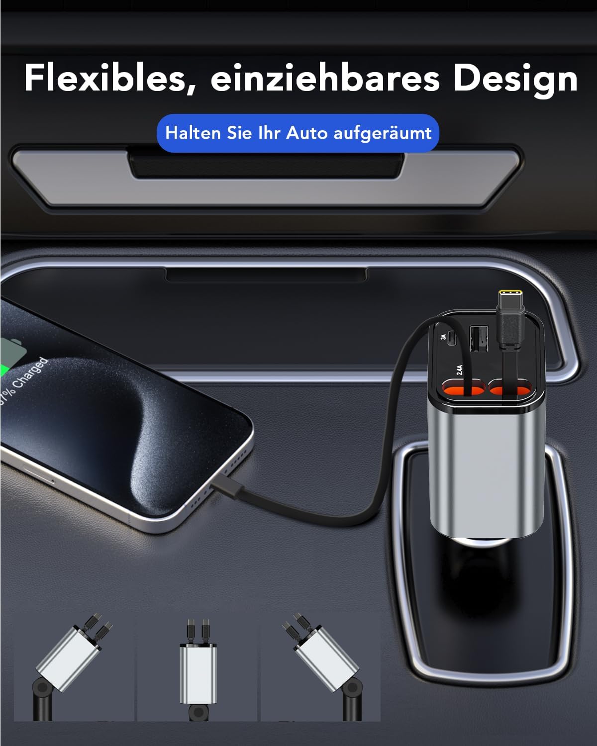 • Прибиращо се зарядно за кола: прибиращият се кабел може да се прибере автоматично след употреба за лесно съхранение. Просто го издърпайте два пъти или докрай и кабелът ще се прибере отново. Кажете сбогом на мръсните кабели в конзолата на колата.