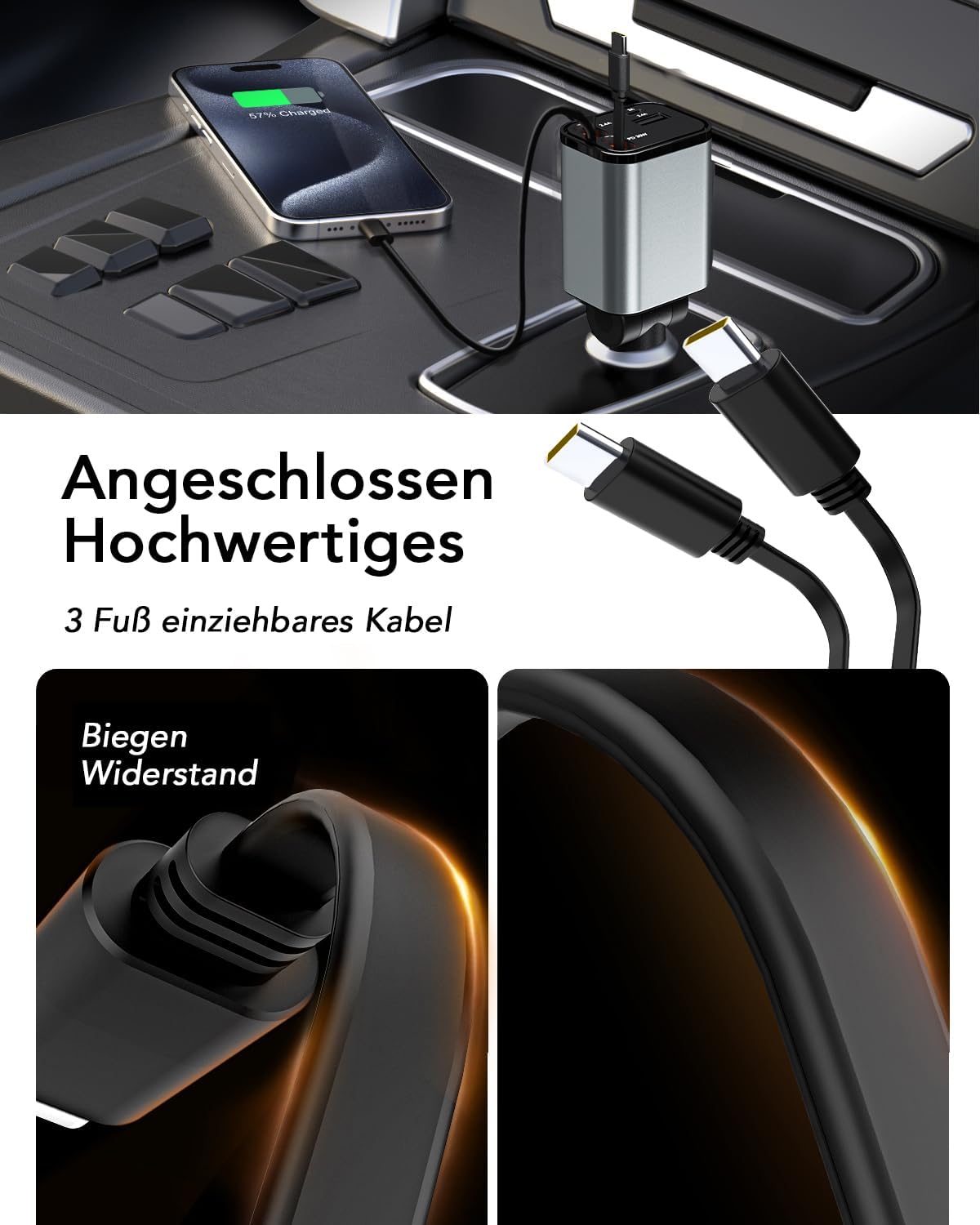 • Универсална съвместимост с превозни средства: зарядното за кола с прибиращ се кабел тип C предлага скорости на зареждане до 66 W, кабел за зареждане на Apple, както и USB и тип C портове. Зарядно устройство с поддръжка на протоколи за бързо зареждане като PD 30W, QC 3.0, AFC, MTK и FCP. Поддържа мобилни телефони, таблети, лаптопи, комутатори, за да отговори на изискванията за супер зареждане, и зарежда до 4 устройства едновременно. Това зарядно за кола е подходящо за автомобили, SUV-ове, камиони, каравани и други превозни средства.