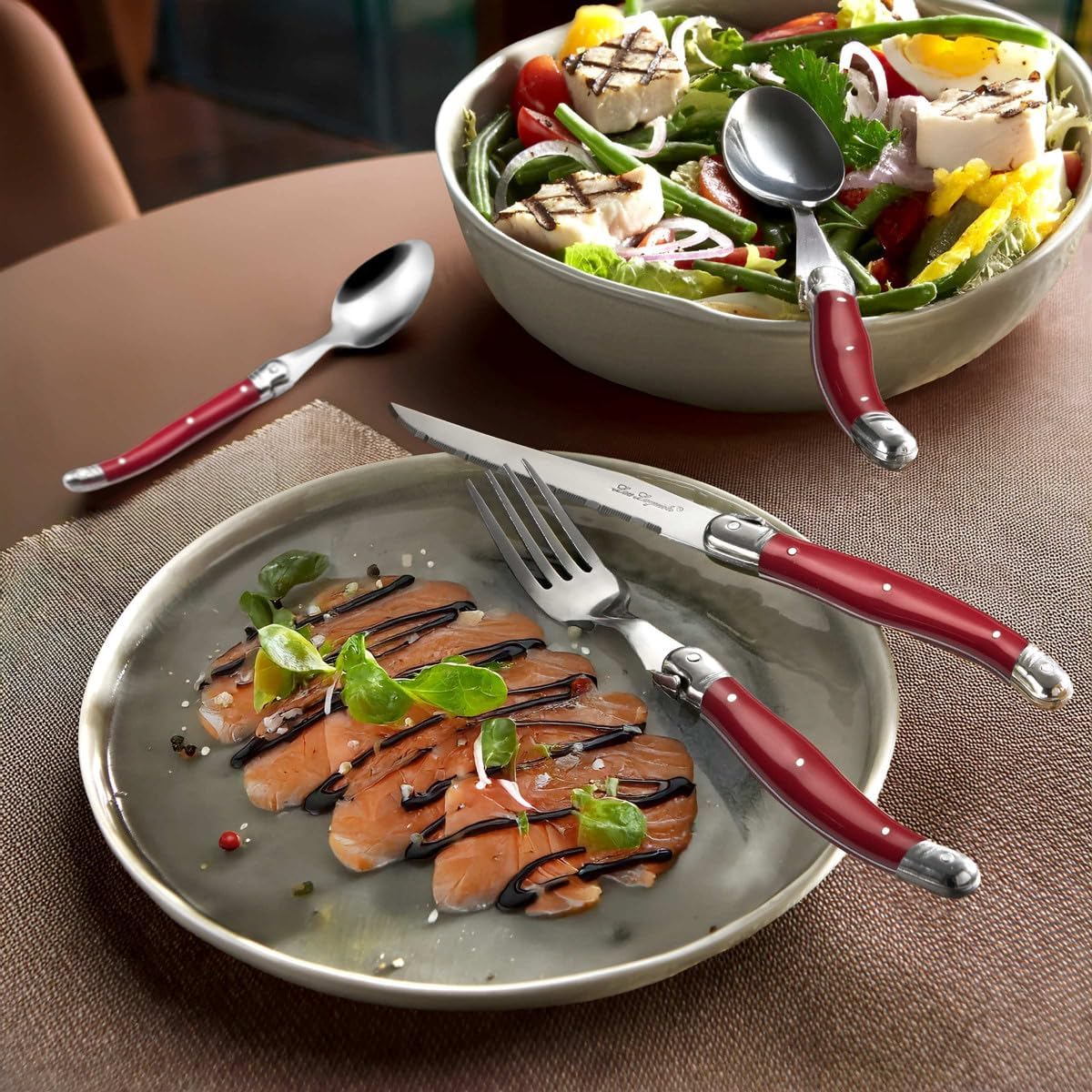 Прибори за хранене Lou Laguiole Steak TRADITION, прибори за хранене, неръждаема стомана с цветни пластмасови дръжки, червени, за 12 души, 48 броя
