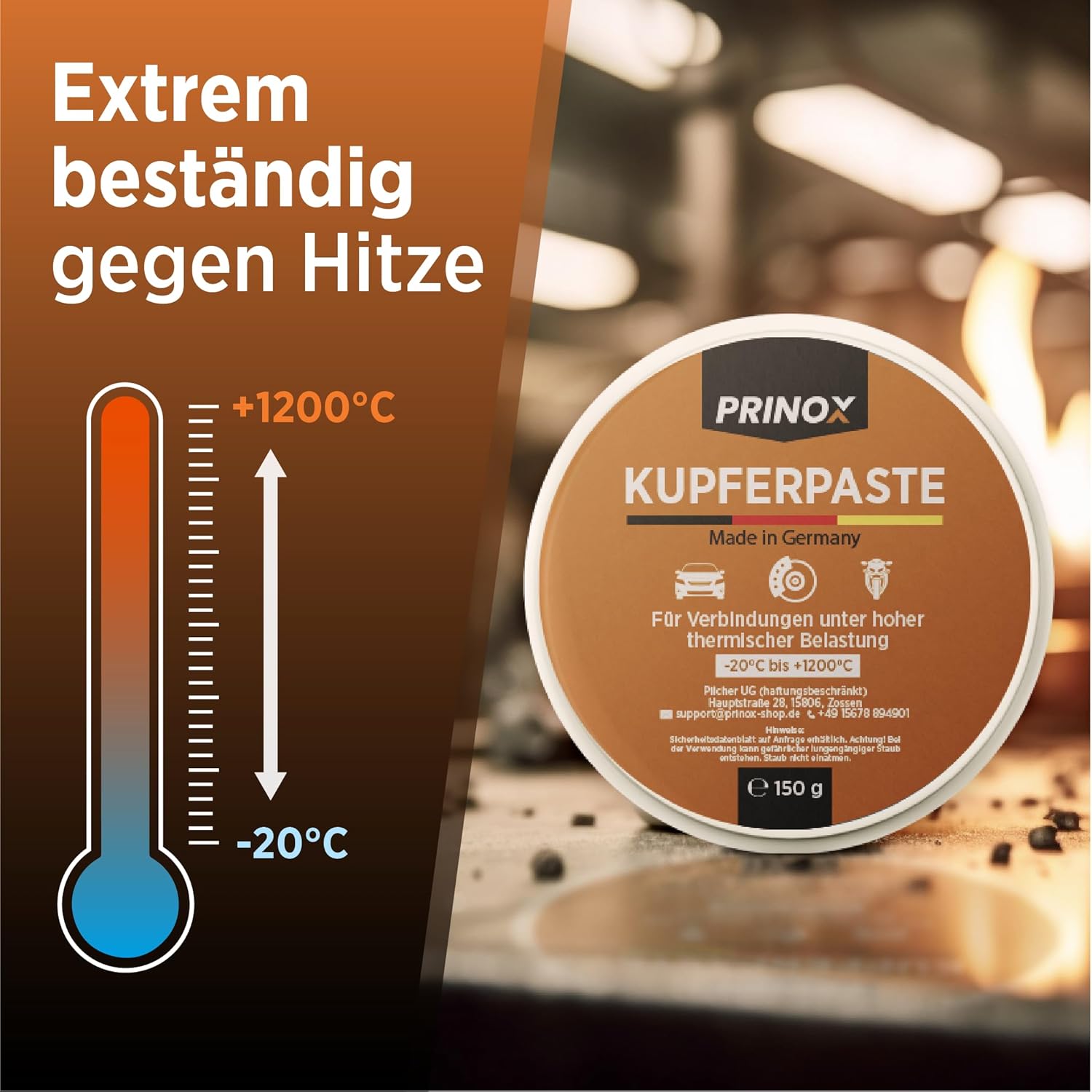• Качество от Германия – професионален продукт, произведен в Германия. Медната паста Prinox отговаря на добре познатите индустриални стандарти за смазващ ефект и устойчивост на корозия. Убедете се сами!