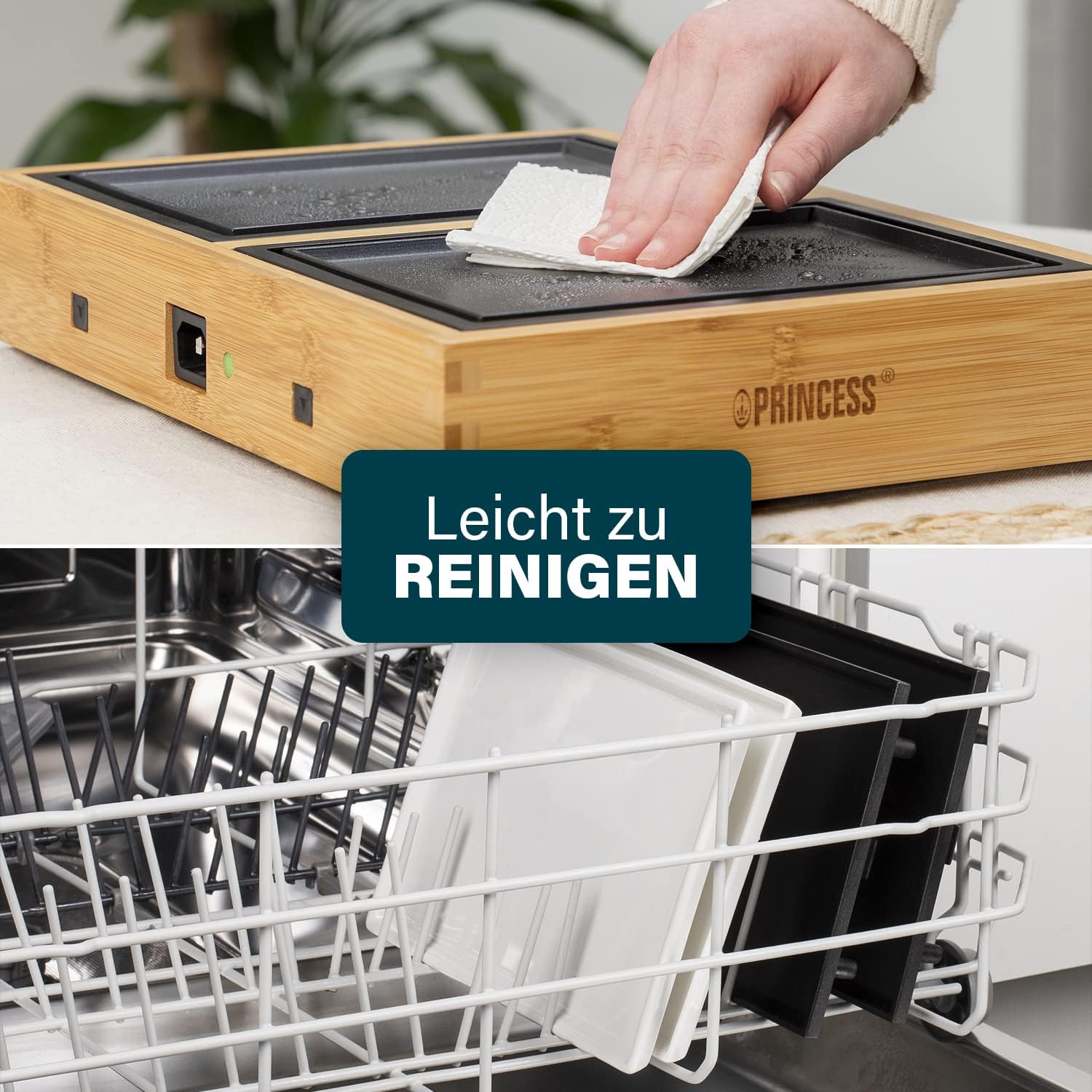 The grill plates can be removed from the housing and are dishwasher safe. So you only need to wipe the bamboo housing with a damp cloth and don't have to worry about the rest.