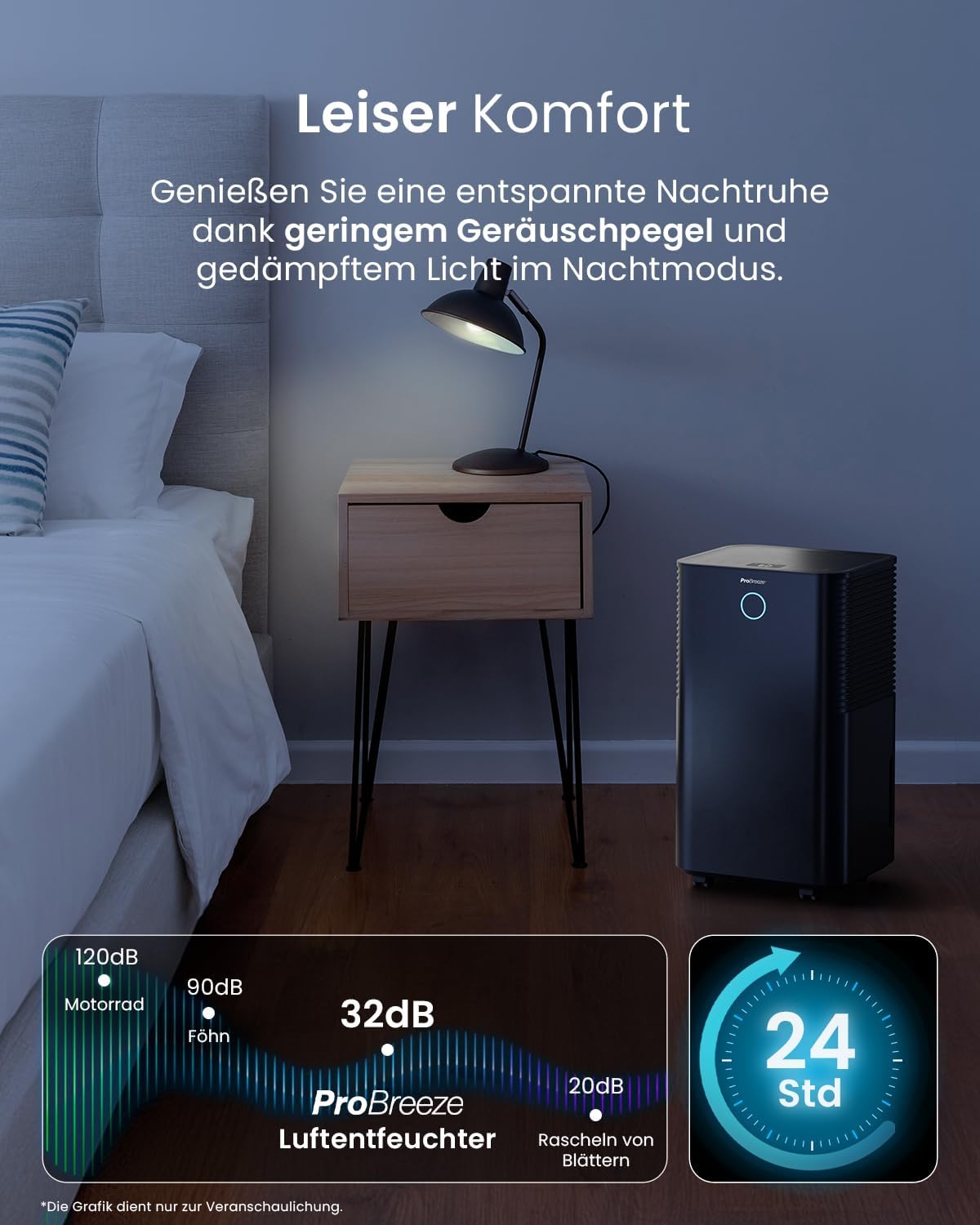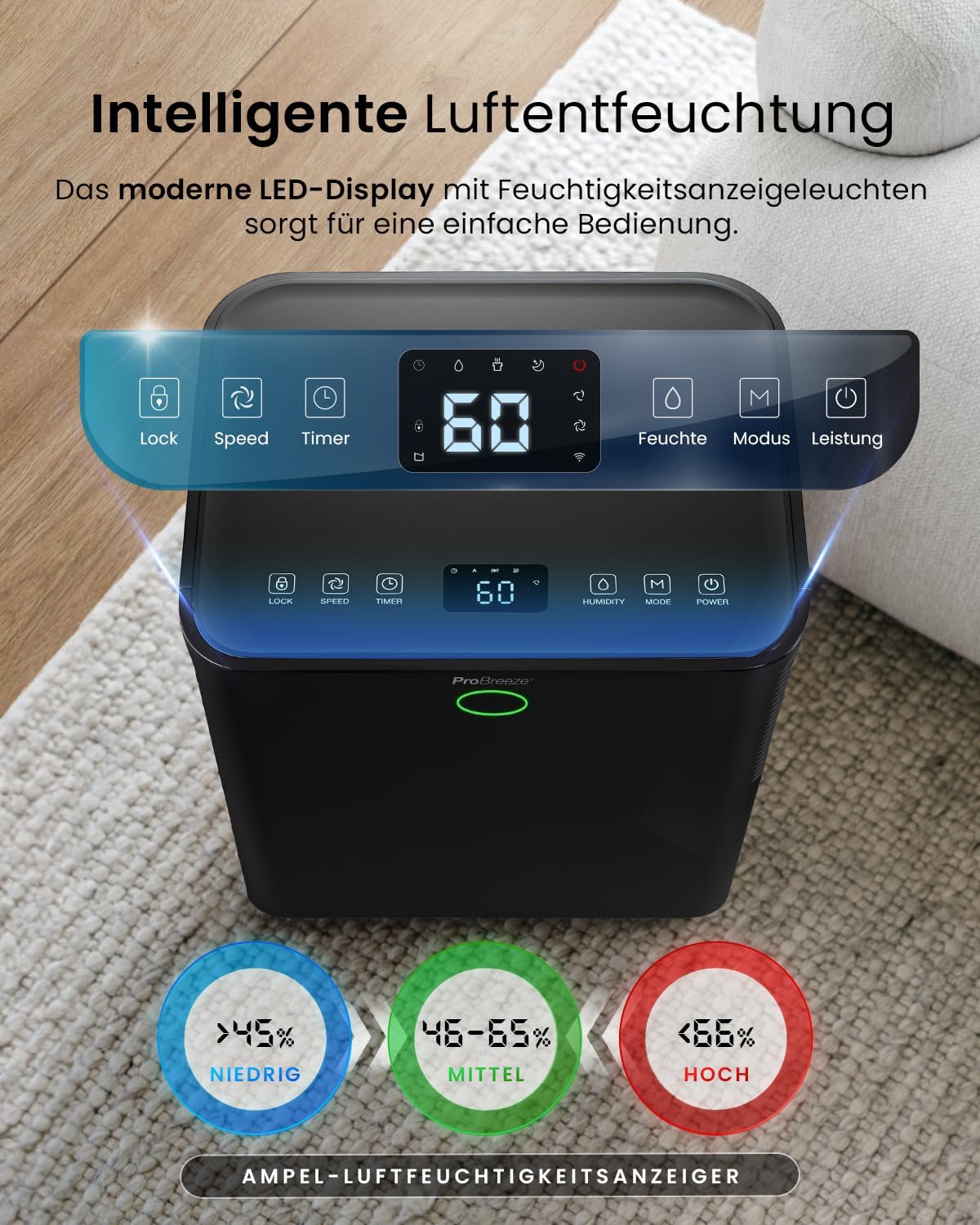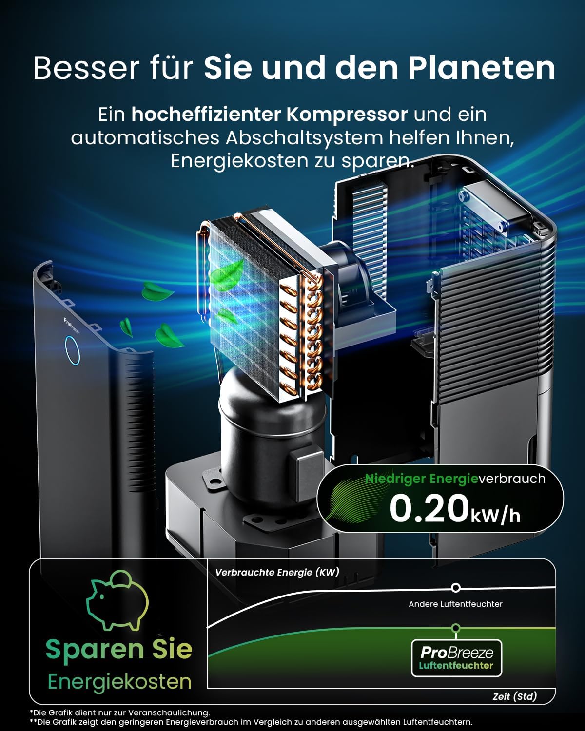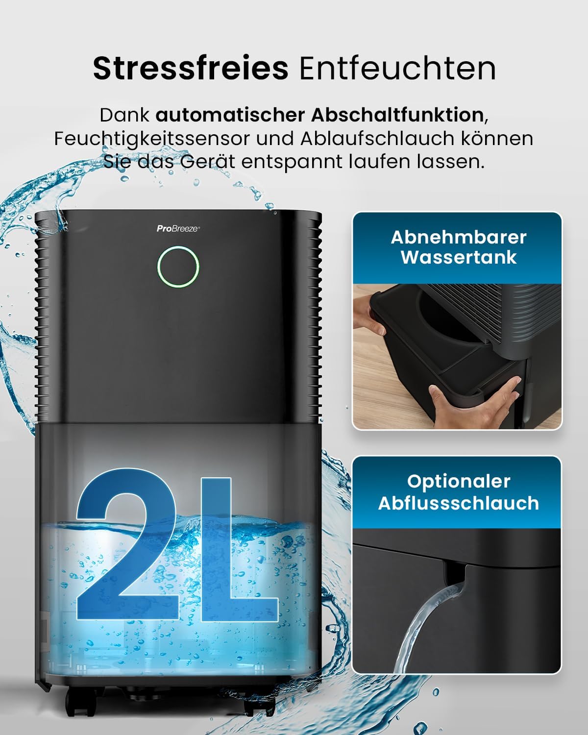 Мощният влагоабсорбатор Pro Breeze бързо и тихо премахва влагата, мухъла и парното от въздуха. Работи с енергийно ефективен компресор и предлага еко режим - идеален за големи помещения с постоянни проблеми с влагата! Благодарение на големия 2-литров резервоар за вода, могат да се отстраняват до 12 литра влага на ден, а включен е маркуч за отпадъчни води за непрекъсната работа. За лесно транспортиране към влагоабсорбатора са прикрепени 4 колела.