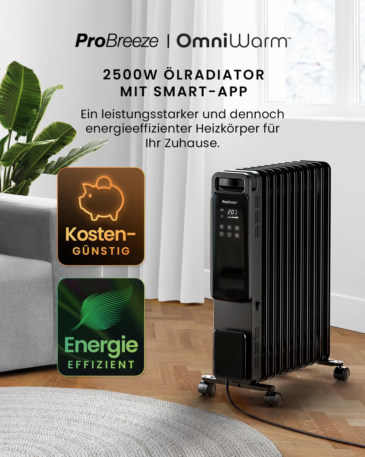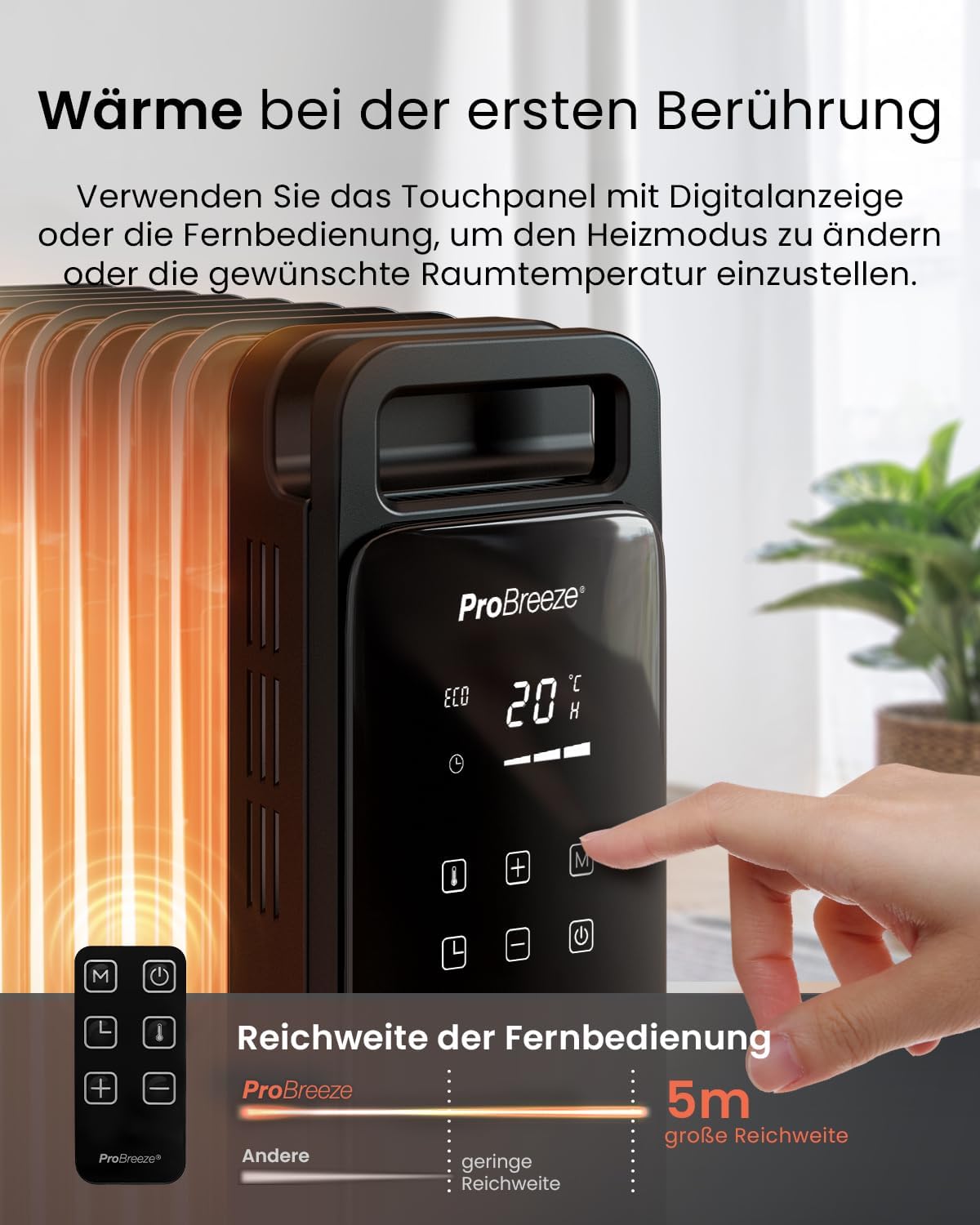 Pro Breeze OmniWarm маслен радиатор 2500 W с 11 ламели, електрическо отопление - енергоспестяващ маслен радиатор, 3 степени на нагряване, регулируем термостат, 24-часов таймер, сензорен дисплей и функция за безопасно изключване